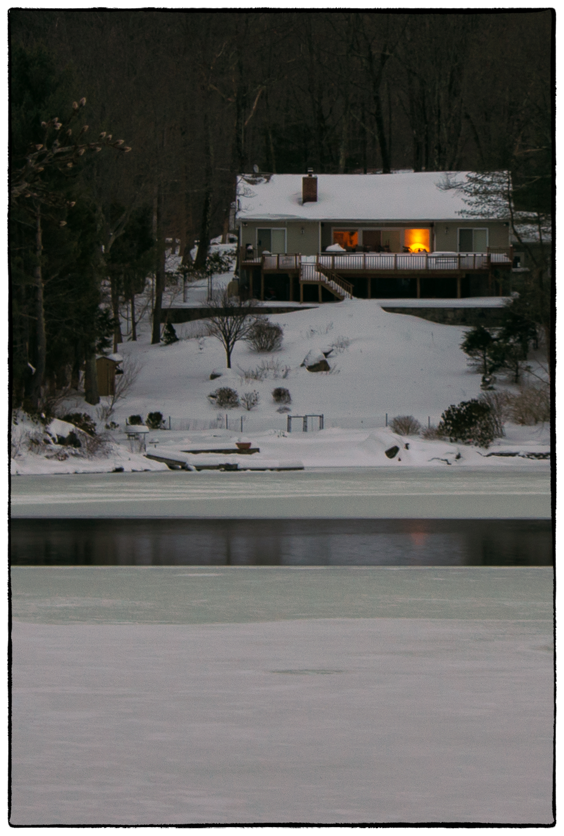 March 15 and we’d just had a major (15 inches) snow storm. The sun had just about gone down, and I was sitting at the computer, occasionally lifting my head and looking out across the lake, when I noticed a light in one of the houses on the other side of the lake. Because of the snow and the increasing darkness all around it was dark and somewhat monochromatic – except for the warmth coming from the light. I was immediately taken by the contrast. It made me feel, that despite the cold and the snow there was “light at the end of the tunnel” and that Spring was not far away.