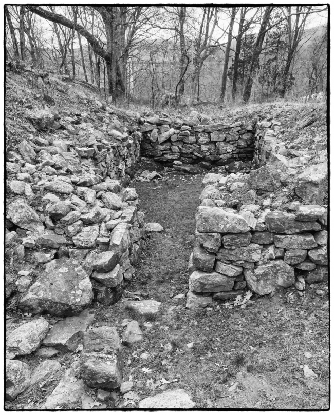 Fort Montgomery’s powder magazine provided secure, dry place in which to store the garrison’s gunpowder and ammunition. The magazine was located here because of the site’s good drainage and because of the protection afforded by the rock ridge between it and the river. The magazine was build early in the fort’s construction. By the middle of June 1776, its 8-foot thick walls were completed, and masons were ready to finish its arched brick vault. Once finished, the arch was covered with sandy soil and a roof was built over top to finish the magazine.