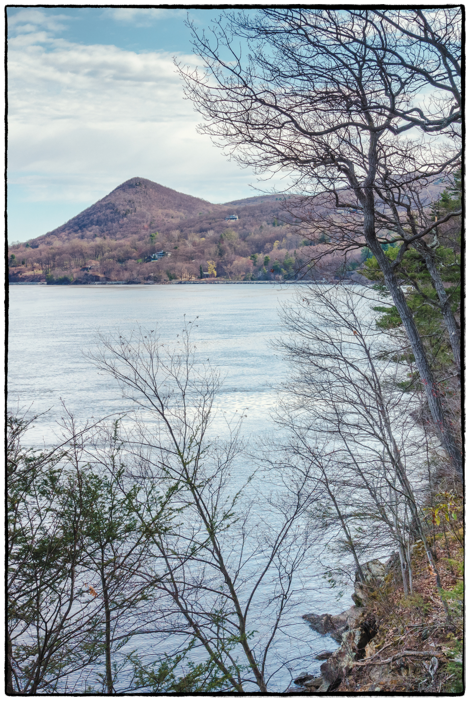 The narrow, rocky trail high above the river offers some spectacular Hudson views. Here the river with Sugarloaf Hill in the background.