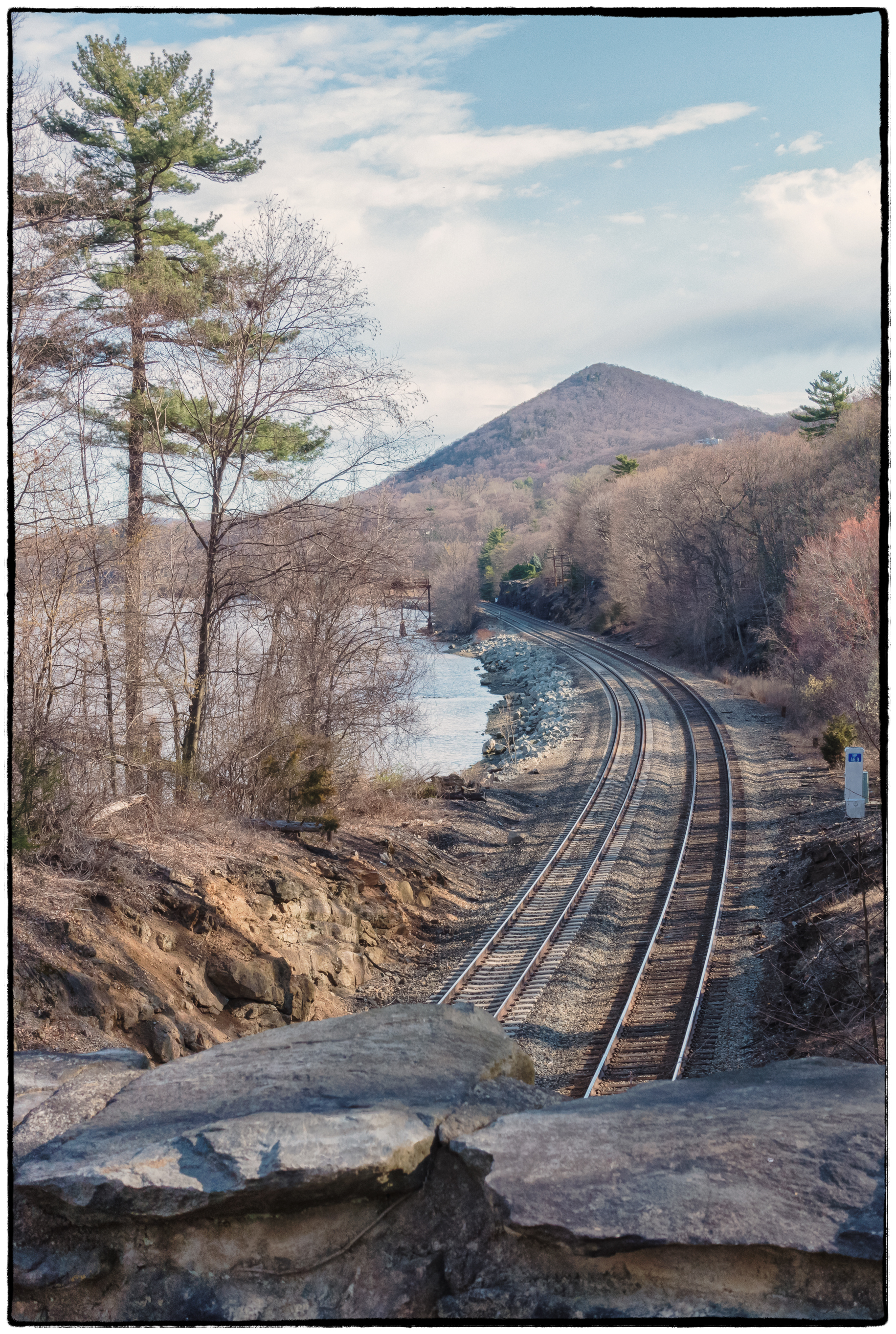 At the far end of the parking lot a trail (white trail) goes off into the woods. I followed this trail for a while , but didn’t have much luck with it. After a while I couldn’t see any markers and it was far from obvious (at least to me) how to continue. So, disappointed, I backtracked to the parking lot and decided to follow mystery point road. It turned out that this was the right thing to do. The “road” winds down, crosses a stone bridge over a brook, and eventually crosses the Metro North tracks (see picture above). From there it was easy: By the mansion follow the blue trail to the left and eventually it splits into a loop. Whichever way you go it will take you to the river. Warning: the path along the river is narrow and rocky and passes quite high above the Hudson with steep (in some places as much as 30ft) dropoffs. Definitely not for those (like my wife) who suffer from a fear of heights.