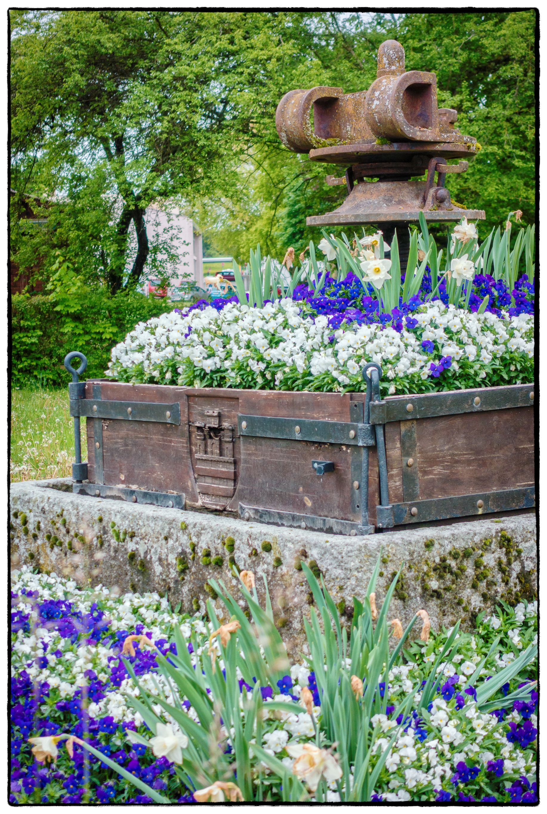 Swiss villages are usually awash with flowers, and Troinex was no exception. Here we see flowers tastefully arranged around some old, rusting machinery all contained in a wooden box bearing the Troinex coat of arms: