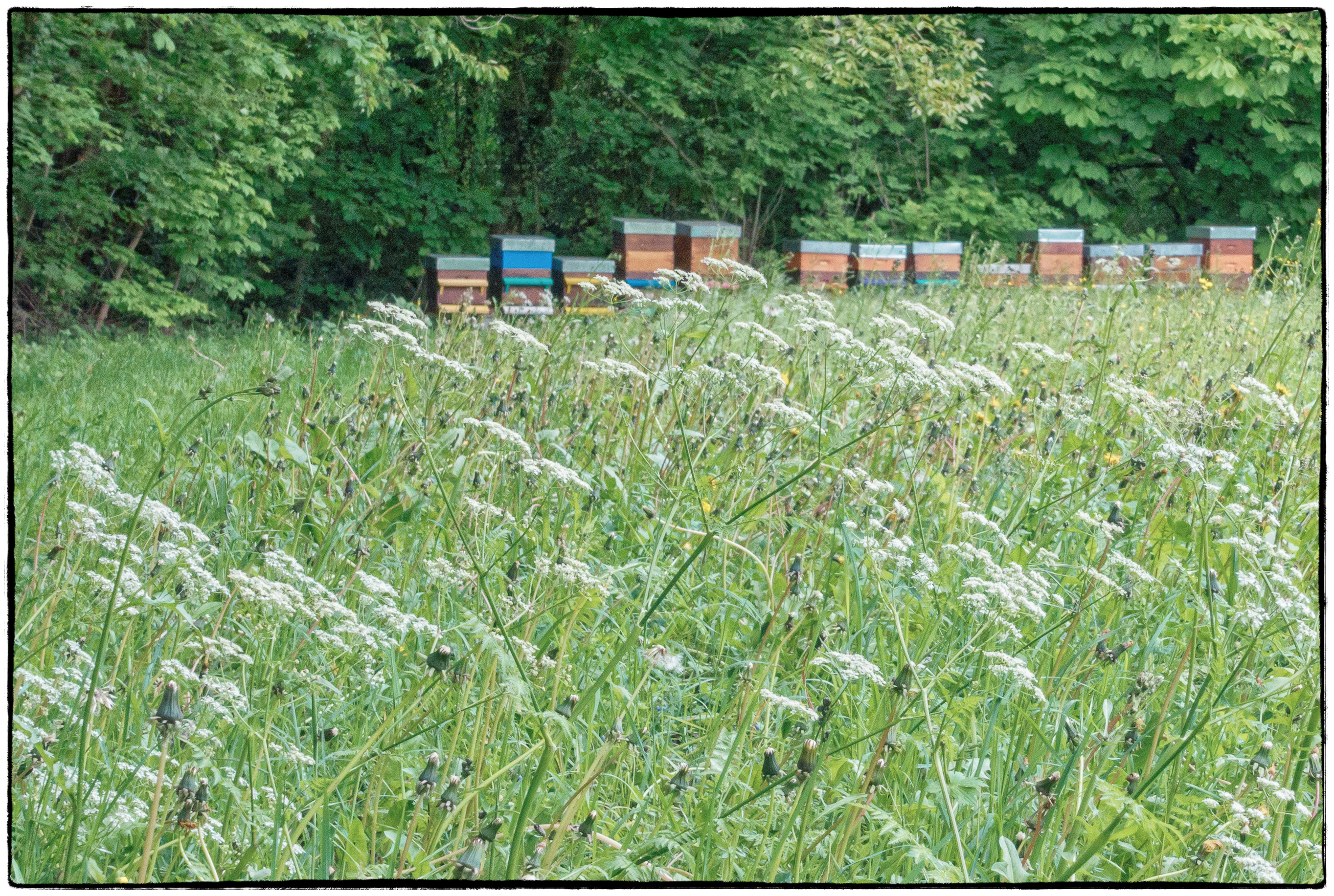 July 12, 2017 by Howard Dale Continuing my walk down the Route de Troinex I came across this field full of wildflowers (or more probably weeds) with a row of what I assume to be bee hives on the other side.