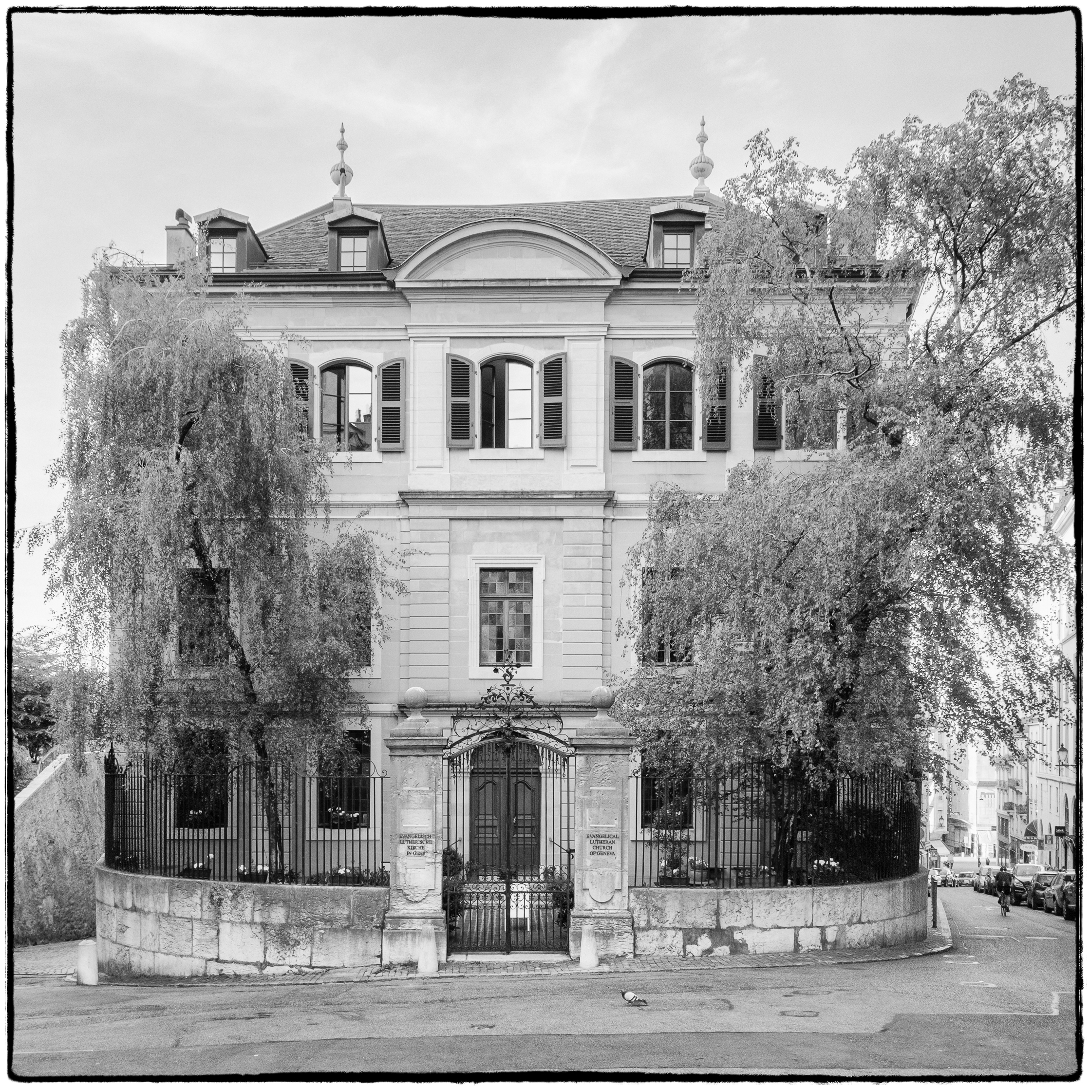 This building stands at the intersection of Rue de la Fontaine and Rue Verdaine. When I took the picture I didn’t know what it was. I just liked the way it looked: the old building with its two trees, ornate wrought iron gate and fence. When I got back home and examined the photograph more closely I noticed that there was lettering on the two pillars on either side of the gate. The English version (the other one was in German) read “Evangelical Lutheran Church of Geneva“.