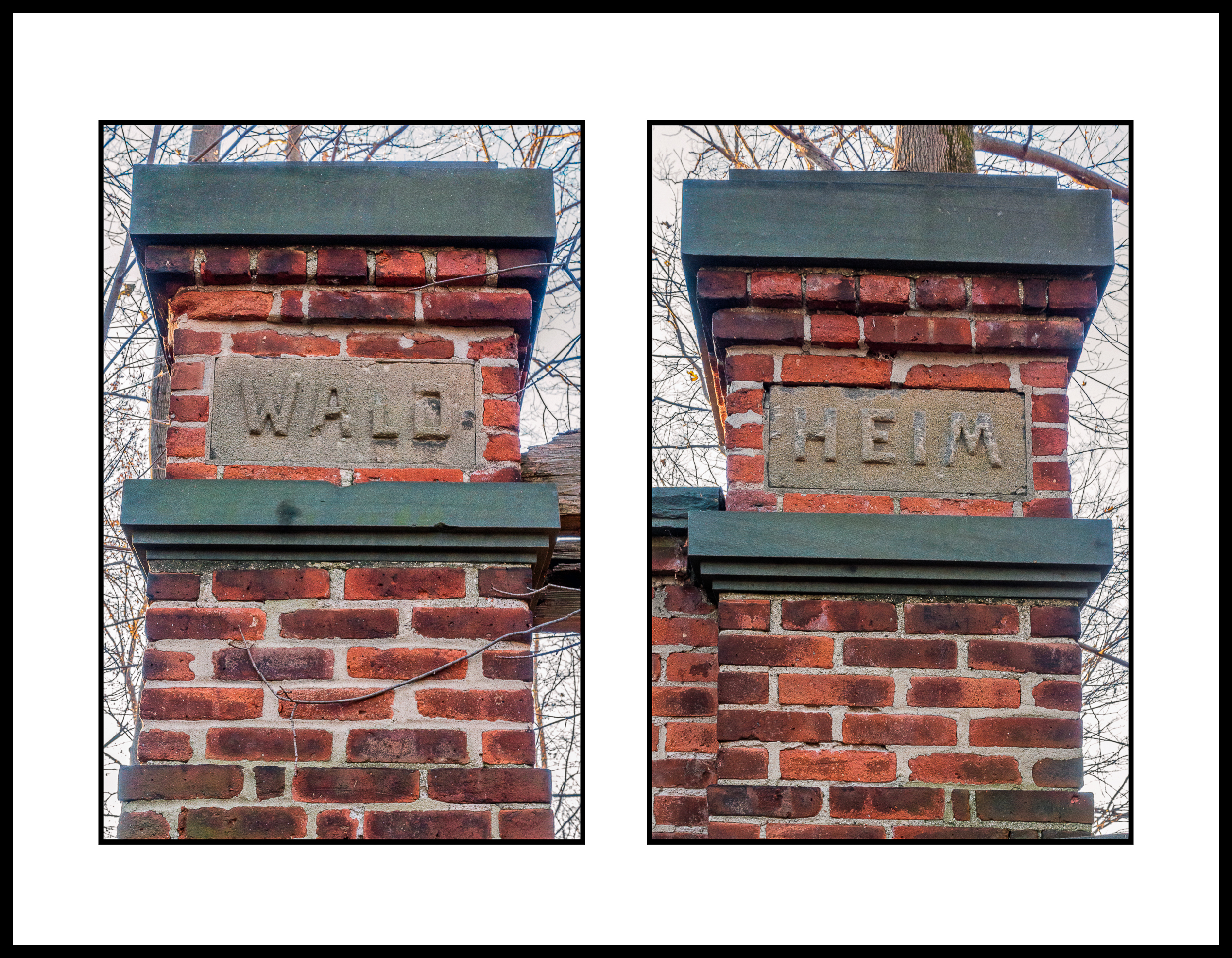 In an earlier post (see: Here’s where we live) I mentioned that our house is located on the site of a former grand estate. It was called ‘Waldheim’ and you can clearly see the name on two of the pillars (see below), which form part of this brickwork