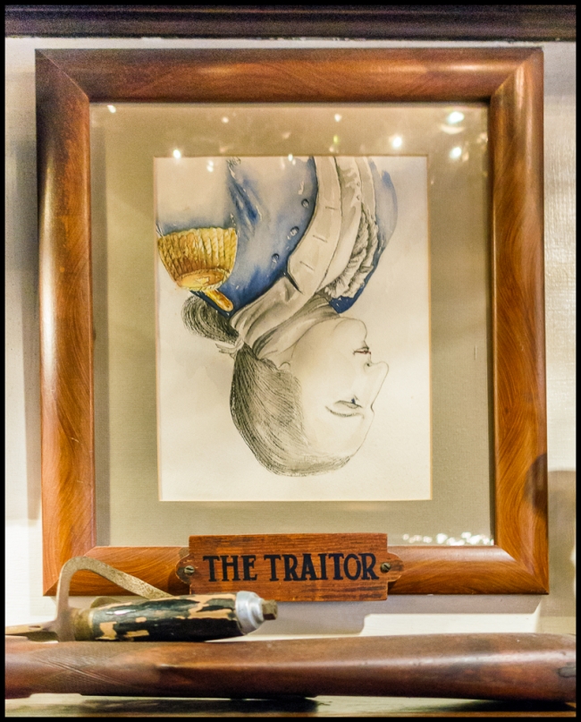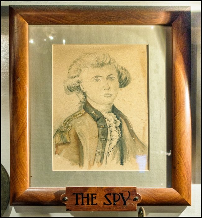 On the mantel of the ’76 House’s lovely blue and white fireplace stand two paintings: one of John Andre (the spy, above) and the other of Benedict Arnold (the traitor, below). Arnold’s portrait is framed upside down!