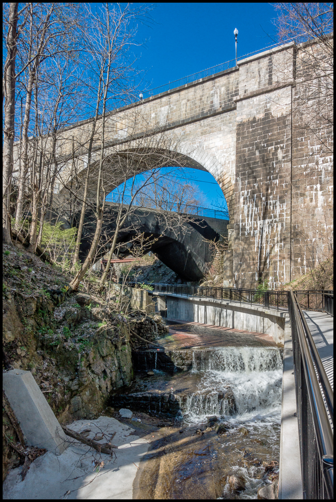 The Double Arches site consists of two bridges spanning the Sing Sing Kill: the 1842 Old Croton Aqueduct bridge and the 1862 Broadway Bridge. The 88-foot Old Croton Aqueduct Bridge traverses the gorge at a level 100 feet above the stream. The bridge was designed by well-known 19th century civil engineer John B. Jervis and built for a cost of $90,685 in 1837 dollars. In the early 1860s, the Broadway Bridge was built to replace a smaller wooden span that was inaccessible to horse-drawn vehicles. The new structure was also built of stone masonry and extends east-west over the Kill Brook. In the early 20th century, the bridges’ similar design and stone construction prompted the community to bestow the site with the name ‘Double Arches’. The image of the Double Arches was later adopted as the seal for the Town of Ossining.