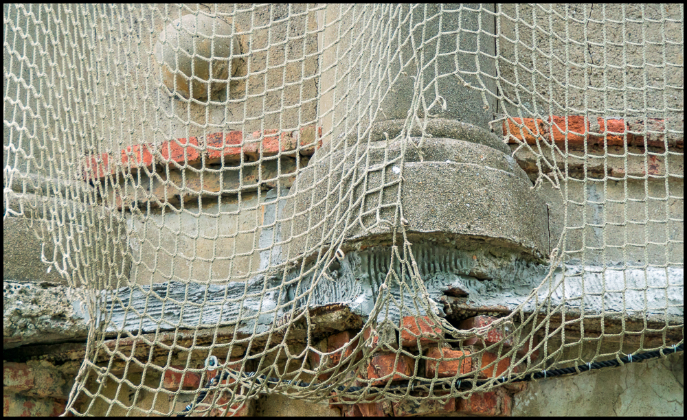 Netting around the outside of the residence, presumably to stop crumbling stone from falling on the heads of the unsuspecting tourists.