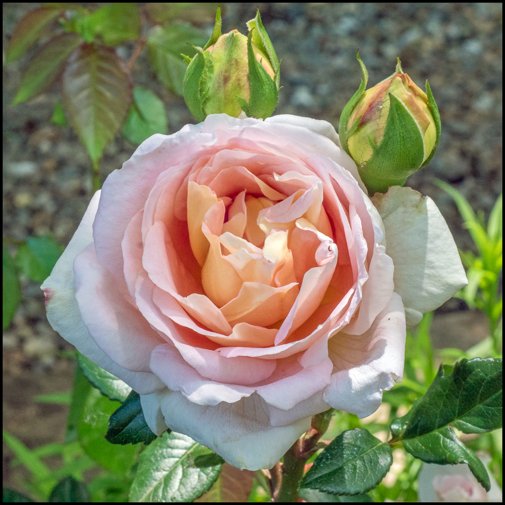 A well-rounded shrub bearing numerous, very large, cup-shaped flowers in shades of apricot and yellow, becoming tinted with pink as they age. It has a rich, fruity fragrance with a refreshing sharpness.
