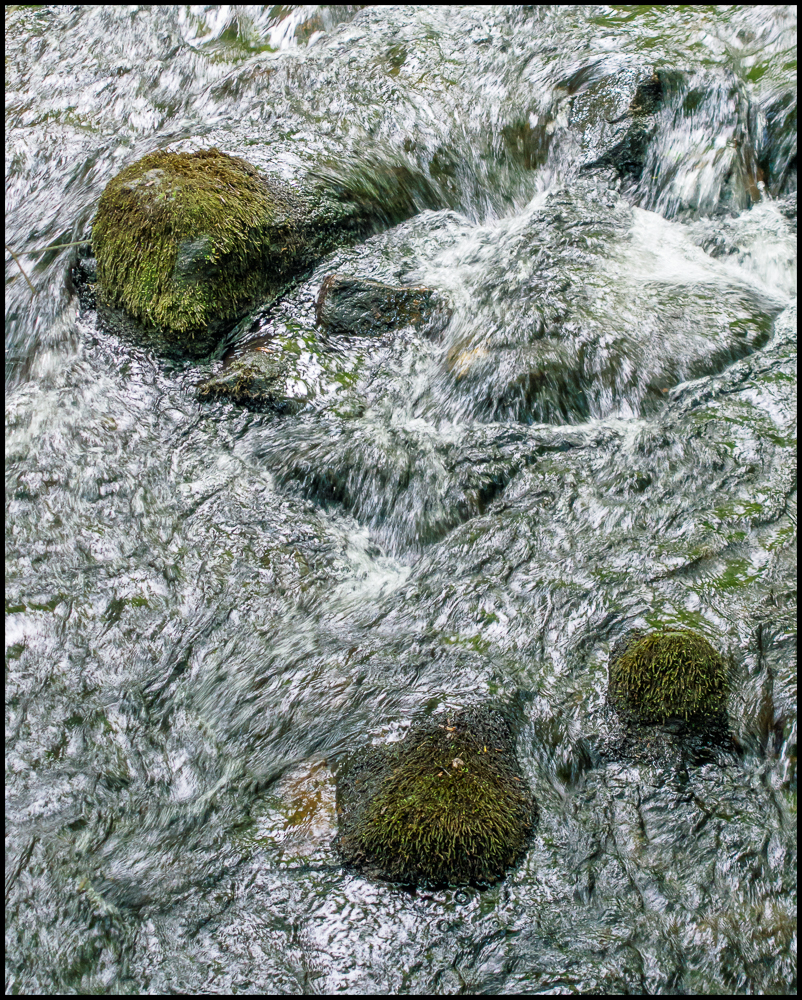 Not far from its beginning the trail passes of a stream. Standing on the bridge over the stream I looked down and noticed these three weed-covered rocks with the water rushing around them.