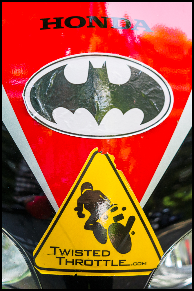 A while back we went to pick up some food (See A craving for barbecue and Bikers Arrive). I noted the owner of each bike before taking some pictures. As we were waiting for the food to arrive I heard one of the servers ask for the name of this bike’s owner (presumably so she could bring him his order). “Batman” he replied.