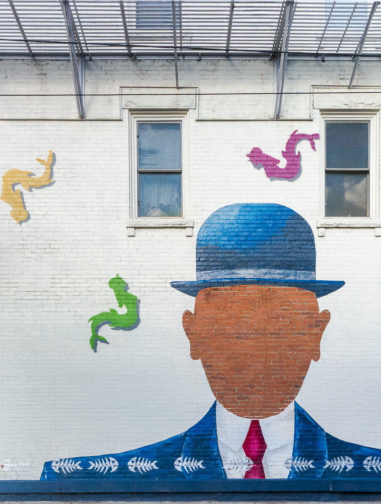 I came across this image painted on the wall of a building in Beacon, NY. It reminded me of something by the famous Belgium surrealist painter René Magritte whose paintings often featured bowler hats.