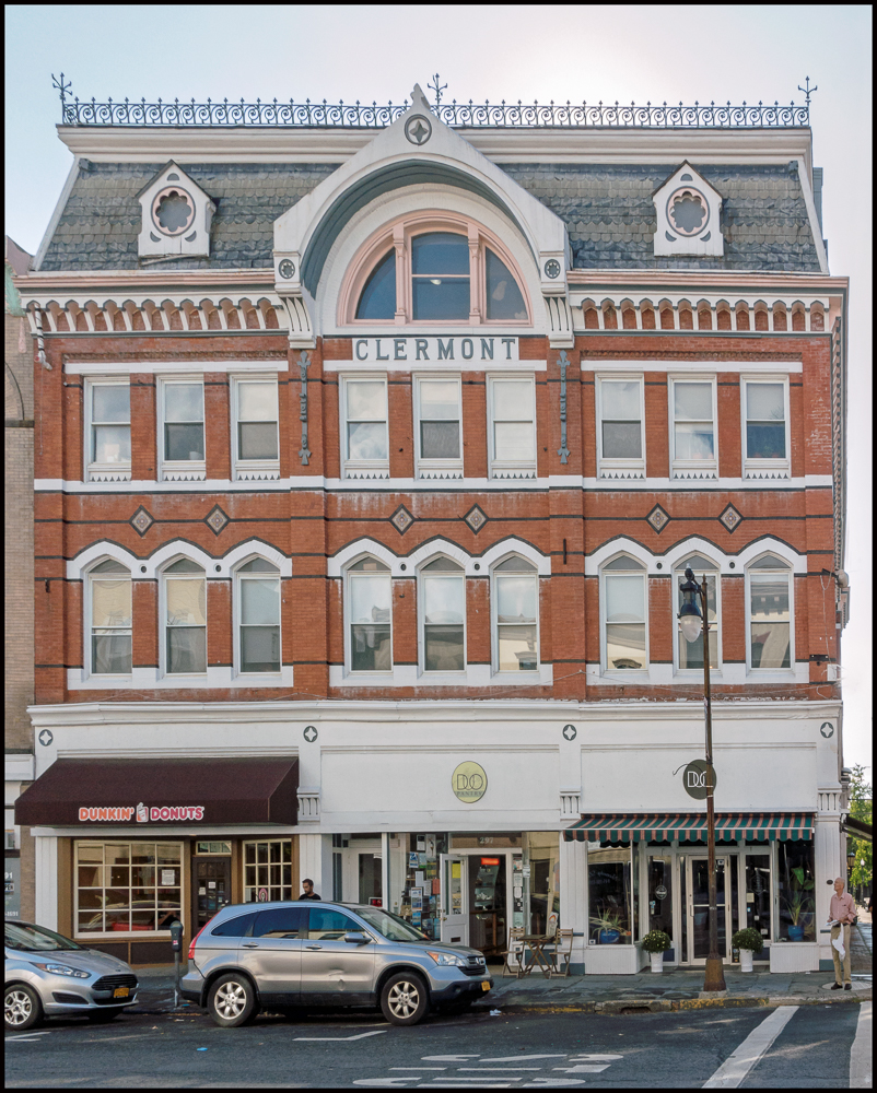 “The Clermont. 295-299 Wall St. Built in 1878 on the SW corner, The Clermont ranks as the finest surviving 19th century commercial building in the uptown business district. Outstanding features include the mansard roof with iron cresting and polychrome tile inserts in the brick walls” (A walking tour. The Stockade National Historic District of Kingston).