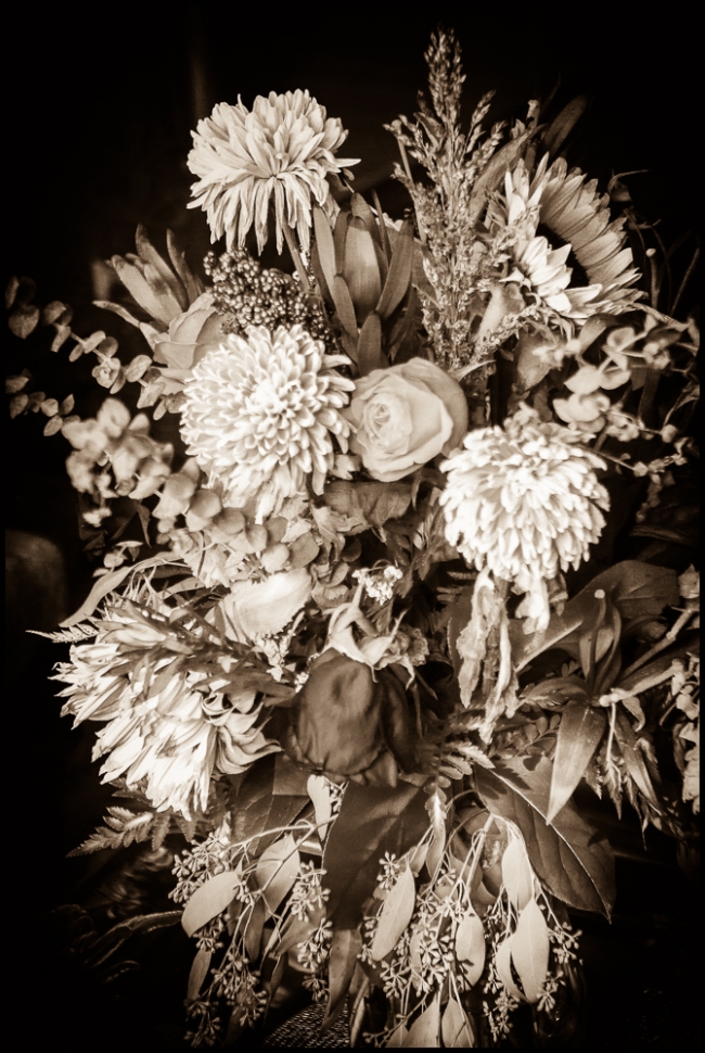 We recently received a bouquet of lovely flowers. After a while they were starting to fade so I decided to take a picture of them. The light was rather low and I had very little room in which to take the pictures so the focus is a little off and the picture is a bit blurry. I thought it would be appropriate to give it an “old time” look.