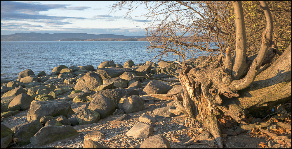 Last Thanksgiving I took the dog for a walk at Croton Point Park, NY. The weather was great, and the light was superb. Above: Rocks and a tree (with roots) looking vaguely North over Verplanck. You can just make out the Bear Mountain Bridge in the background, and behind that the Schunemunk Mountain State Park (I think).