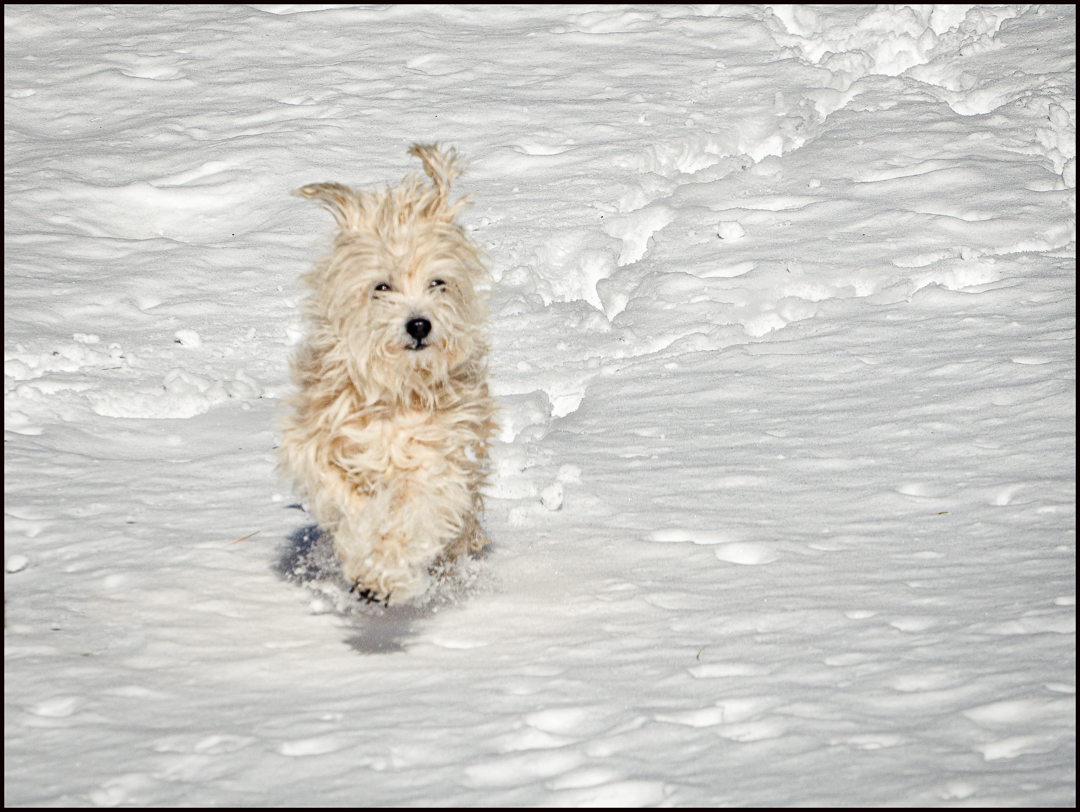 Harley has figured out that the snow is now hard enough that he can run on top of it. Look at the ears in the second picture.