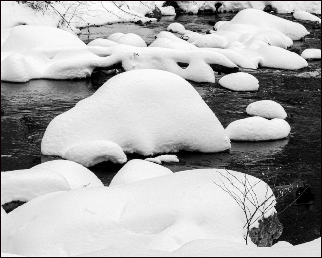 I liked the contrast between the bright, white snow and the darkness of the flowing water and the way that the snow has softened the outlines of the rocks in the river.