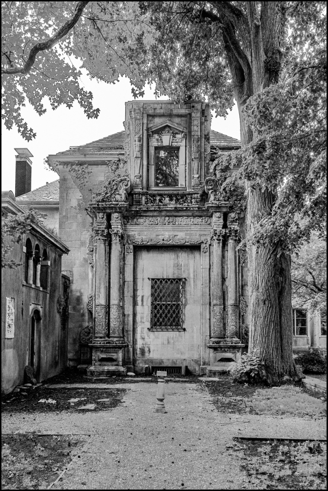 At some point a fragment of a 16th Century Baroque church was affixed to Alder Manor’s north façade. The rectangular space towards the top marks the north end of the indoor swimming pool. It’s missing a stained glass window that was stolen during the 1990s.