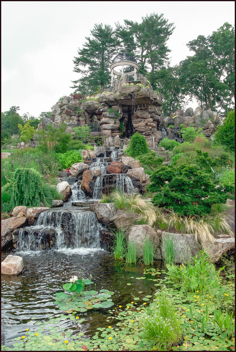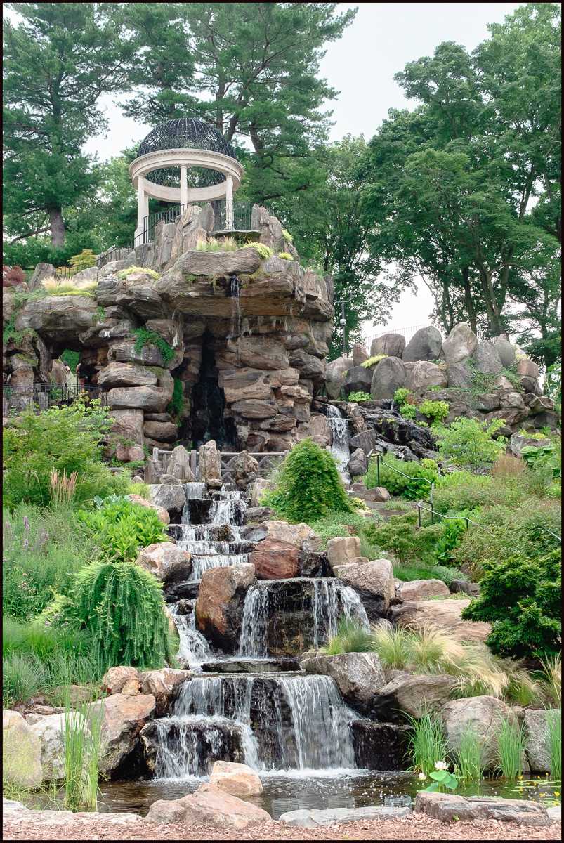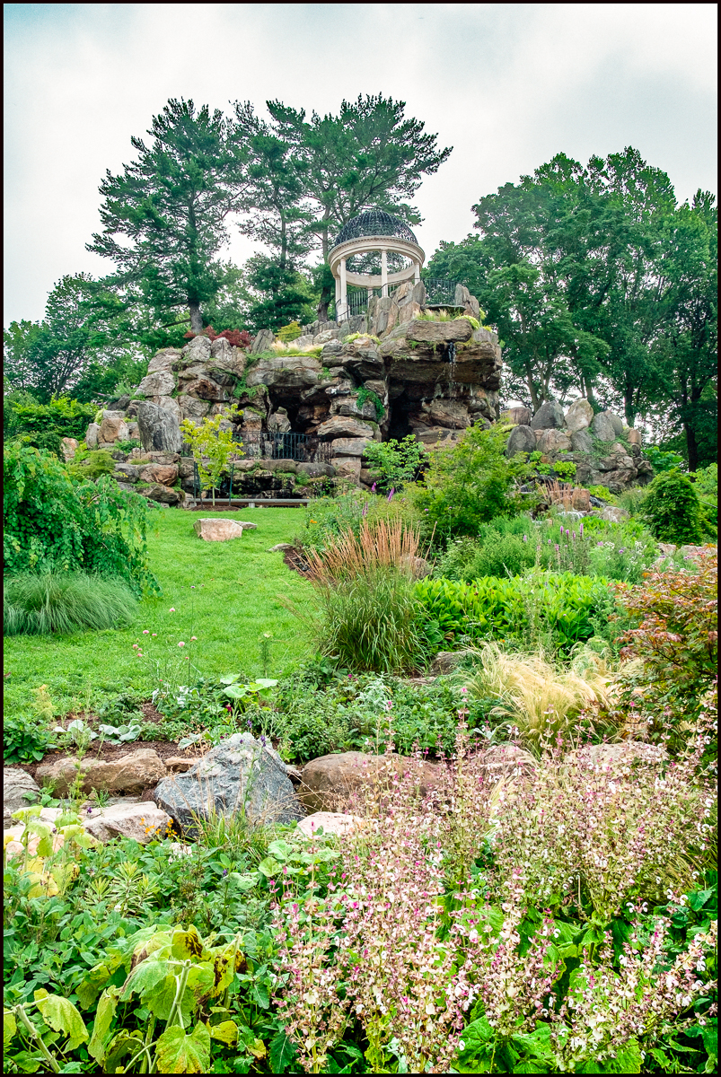 Many of the rocks are hollowed out to form planters, and in Samuel Untermyer’s time, the entire creation was elaborately planted. There are three bridges in the rough stone and a small seating area with a rough hewn stone bench that can be reached through a rocky tunnel in the folly. An additional monolithic bridge crosses the pool at the base of the Temple of Love”. (Untermyer Gardens Conservancy)