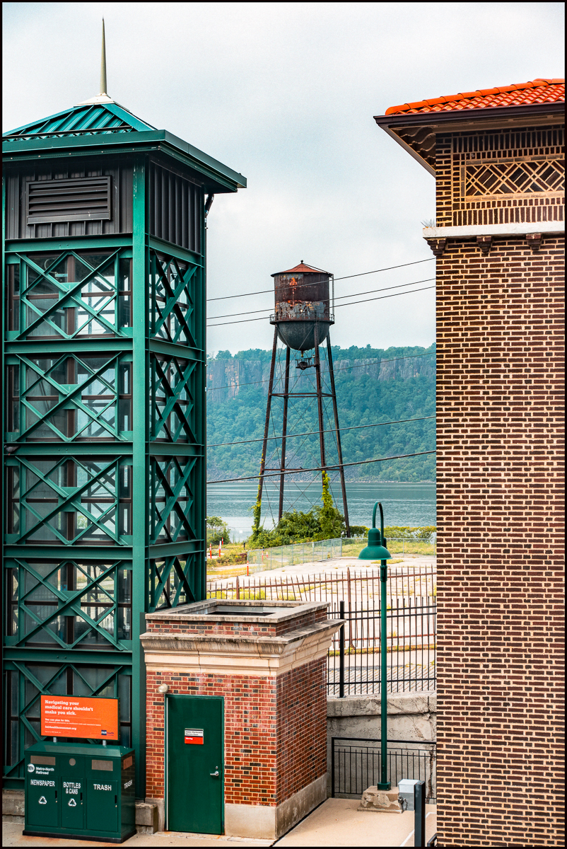 Another view of the water tower with the Palisades in the background. The Palisades are anywhere from 300 to 540 feet high depending on where you are. The water tower is about all that remains of the former Anaconda Wire and Cable (AWC) works. The site is heavily polluted and is in the process of being remediated by the current owner prior to re-development. All the other buildings have been demolished, but the tower has become a symbol of Hastings-on-Hudson and a majority of the residents do not want it to be demolished.