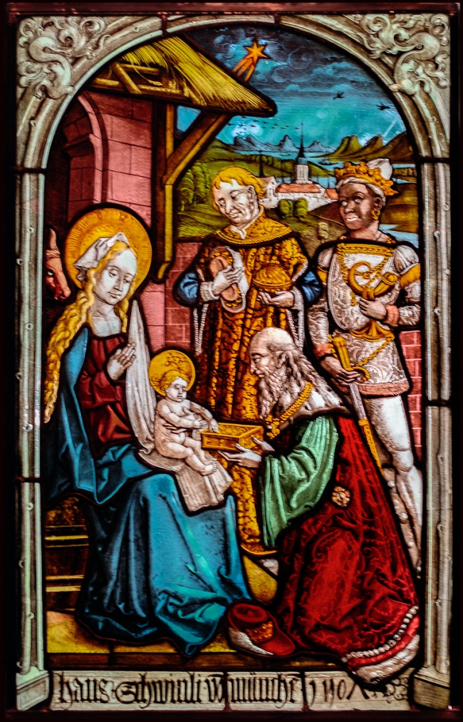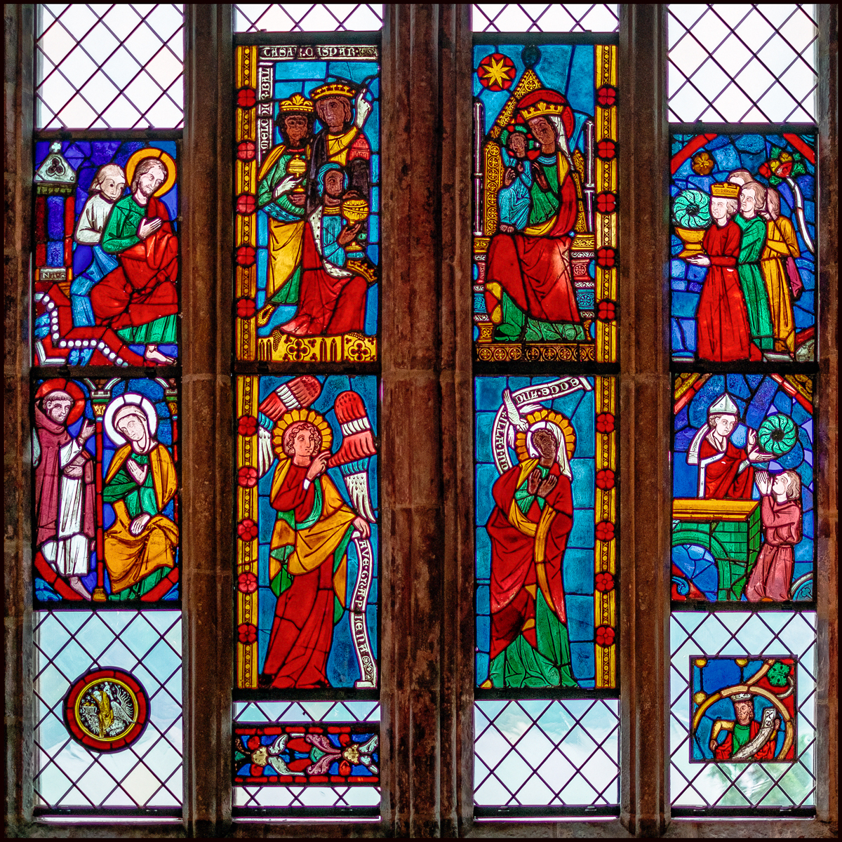 “The Cloisters’ collection of stained glass consists of around three hundred panels, generally French and Germanic and mostly from the 13th to early 16th centuries. A number were formed from handmade opalescent glass. Works in the collection are characterized by vivid colors and often abstract designs and patterns; many have a devotional image as a centerpiece. The majority of these works are in the museum’s Boppard room, named after the Carmelite church of Saint Severinus in Boppard, near Koblenz, Germany. The collection’s pot-metal works (from the High Gothic period) highlight the effects of light, especially the transitions between darkness, shadow and illumination. The Met’s collection grew in the early 20th century when Raymond Picairn made acquisitions at a time when medieval glass was not highly regarded by connoisseurs, and was difficult to extract and transport.