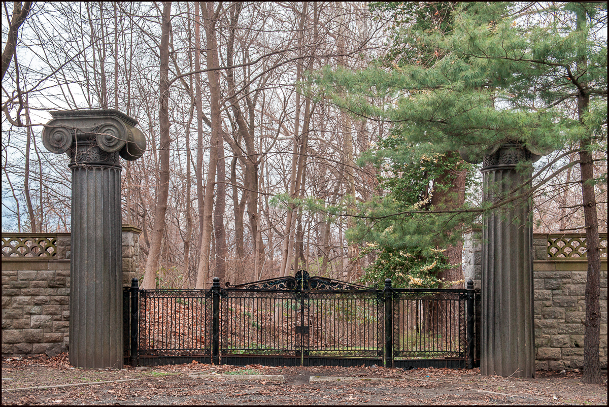 Above: The former entrance to to the Frank A. Vanderlip, Beechwood. While Vanderlip was vice president of the First National City Bank (later Citibank), he had two fluted smoked granite columns from the headquarters 55 Wall Street shipped to Beechwood (55 Wall Street was being remodeled and the columns were re-spaced, with two left over). He had the columns placed two-thirds above ground in Beechwood’s entranceway off of Albany Post Road , an entrance which was later closed due to increasing traffic volume on Route 9 (the current entrance is off Scarborough Station Road).