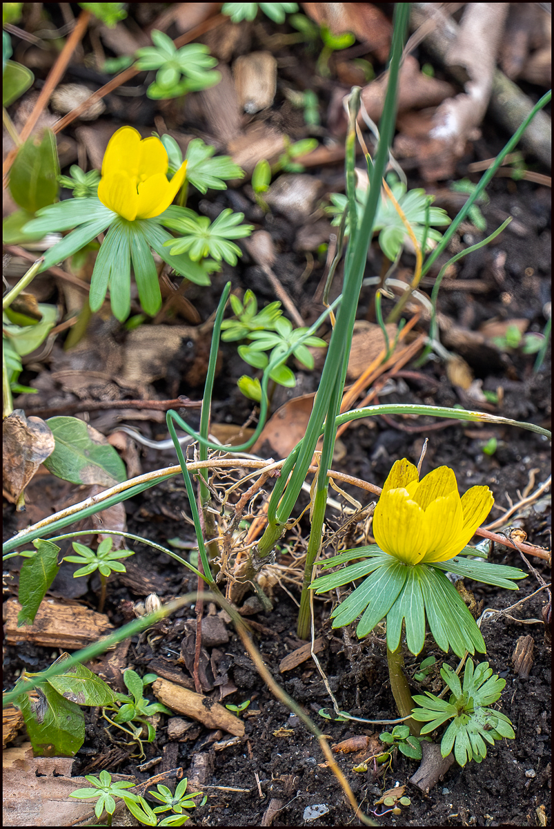 I took these on March 20, the first day of Spring. It was cloudy, and a bit gloomy, but at least there was no snow around and it was fairly warm (that’s not always the case – see the last picture taken on the same date in 2015). To commemorate this I thought I’d take some pictures of Spring flowers. It turned out to be more difficult than I thought. Although there were many shoots, few were in bloom.