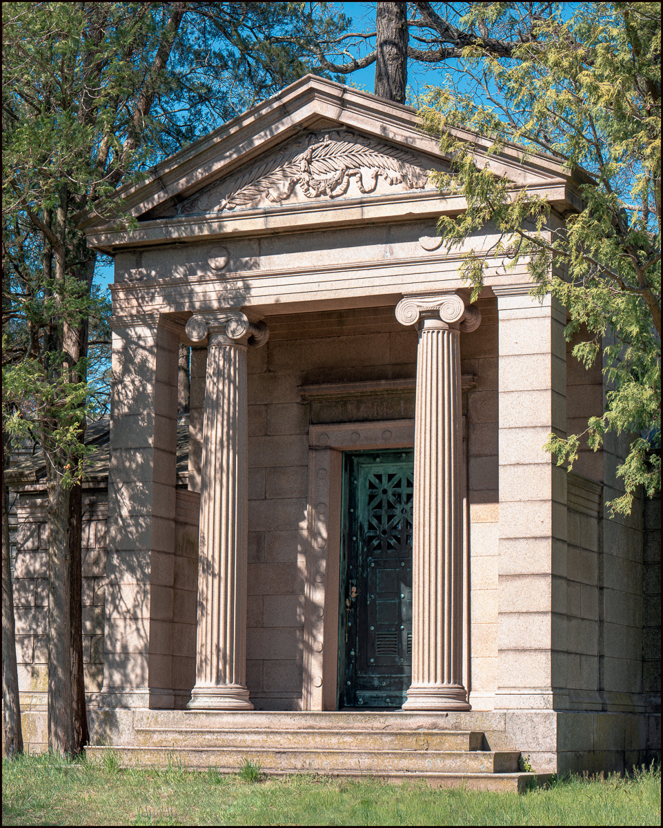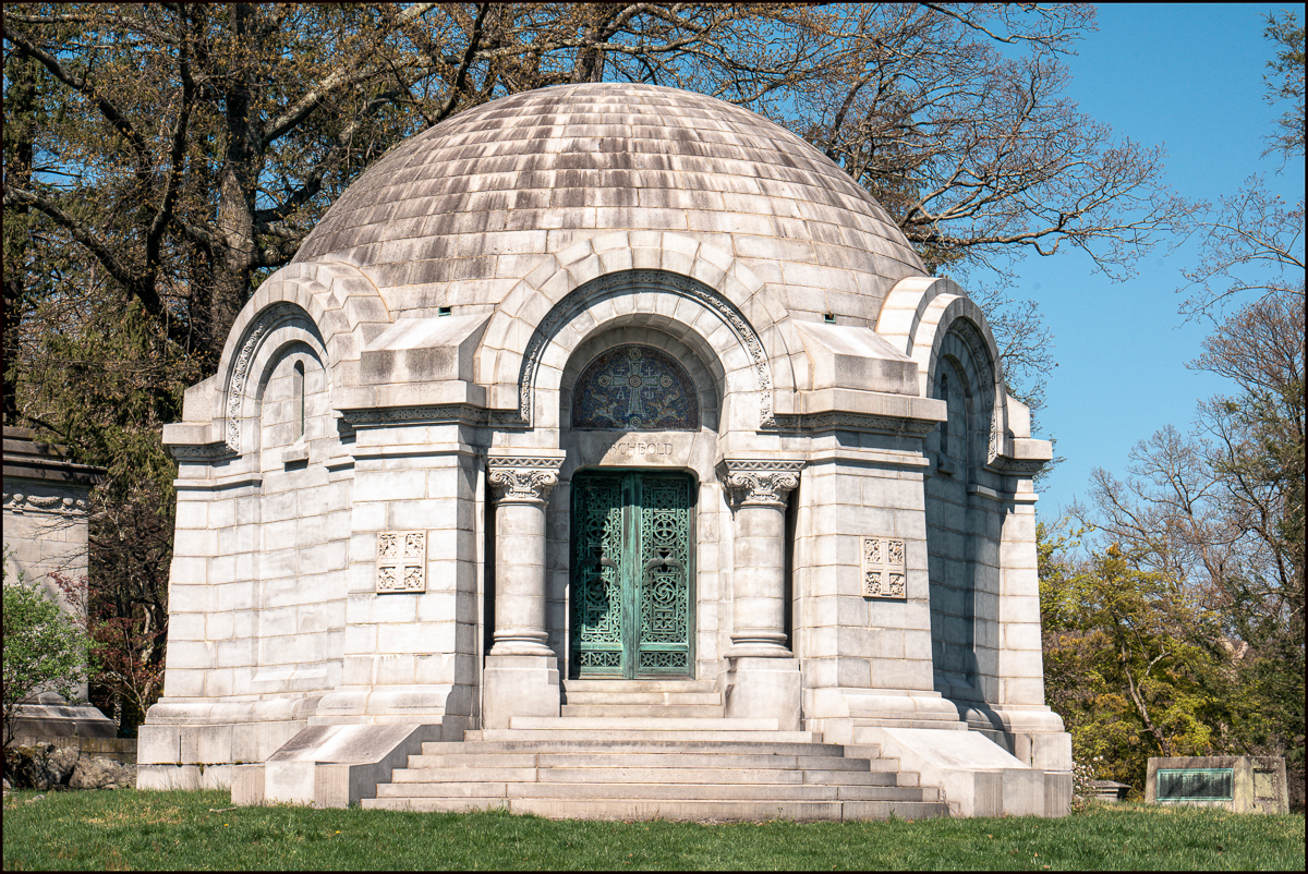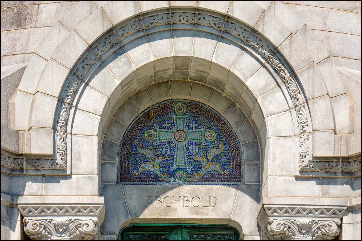Above and the next three pictures: The Archbold Mausoleum – to me perhaps the most spectacular in the Cemetery. “John Dustin Archbold was born in Leesburg, Ohio, and moved to Pennsylvania by 1864. In 1870, he married Annie M. Mills. Together they had four children, Mary Lavina born 1871, Anne born 1873, Frances born 1875, and John Foster born 1877. He became president of Acme Oil Company. In 1875, he became a director and vice president of Standard Oil Company until 1911 when he took over as president. He held this position until his death in 1916.”
