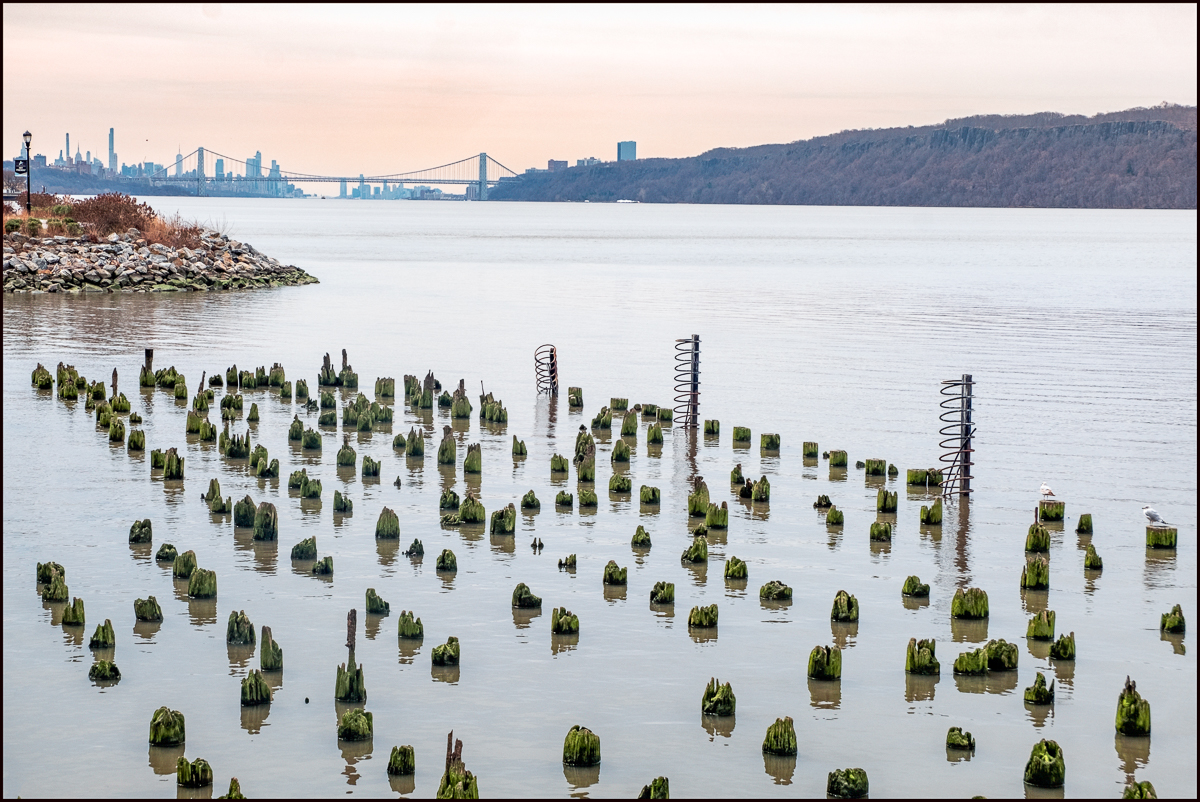 View from the Hudson riverfront looking South. In the distance you can see the George Washington Bridge and some of the Manhattan skyscrapers.