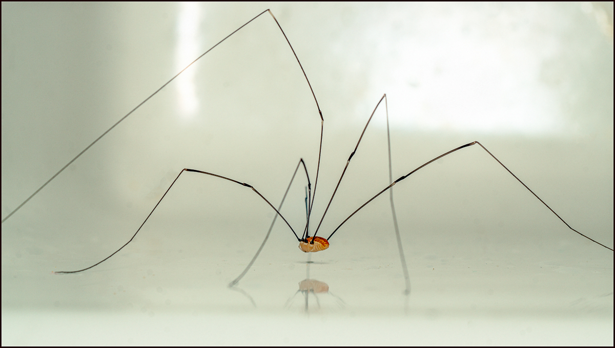 I came across this in my kitchen sink. A spider I thought, but then I looked more closely and noticed that it only had six legs. So some other kind of insect then. However, when I looked more closely I realized that it was supposed to have eight legs, but had apparently lost two of them. OK so it was a spider after all. I was wrong again. It is an arachnid, but not a spider. So what is it? It turns out that it’s something called a Harvestman and it’s more closely related to ticks, mites and scorpions than it is to spiders. How can you tell the difference? Well, spider bodies have two segments: a combined head/thorax and an abdomen. Harvestmen have a single body. Spiders also usually have eight eyes where Harvestmen only have two. Scientists have identified over 6,000 species of Harvestmen and estimate that there are probably over 10,000. They’ve also been around for a very long time: specimens have been found encased in amber that is over four hundred million years old, so I suppose they’re doing something right. This one had a leg-span (if such a word exists) of over three inches, but the body was only about 1/8 inch. Some people call them ‘daddy longlegs’, but that’s confusing as at least three different species are often called ‘daddy longlegs’: Harvestmen, Crane Flies (which are winged insects), and Cellar Spiders (true spiders).