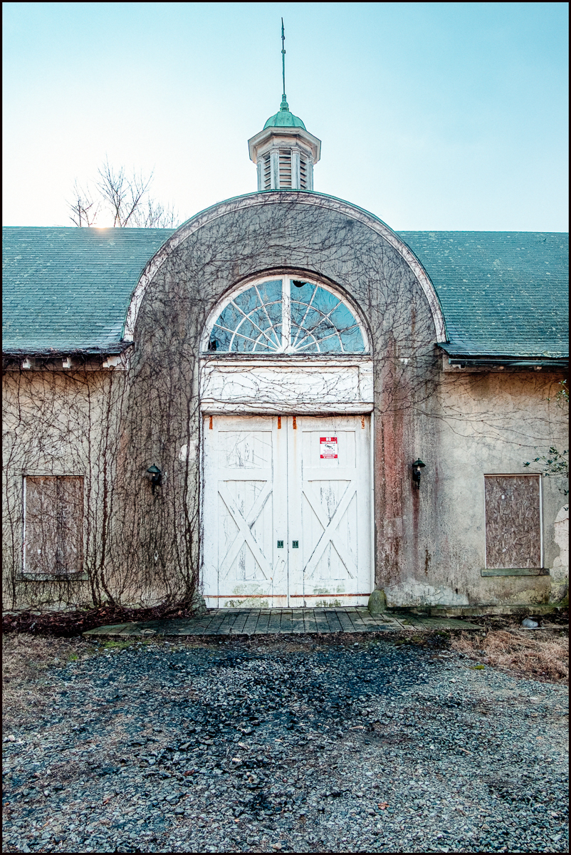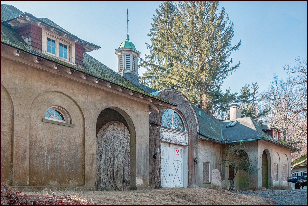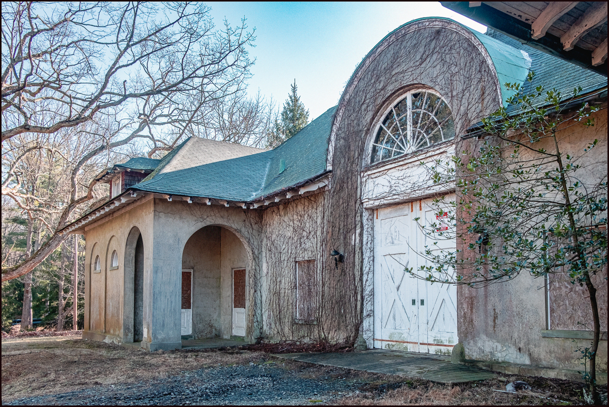 “Circa 1907. South of the mansion on the south side of Byram Lake Road stands a single story carriage house. The structure consists of a rectangular block with two flanking, projecting pavilions at the main(north) façade. The building is sheathed in stucco and covered by a hipped, slate roof, which has several dormers, a chimney, and a rooftop octagonal cupola with a dome. Door openings are located at the center of the north façade beneath a large semi-circular fanlight, which projects above the eaves of the roof. Fenestration consists of six-over-six windows and semicircular lunettes framed within blind arcades.” (United States Department of the Interior, National Park Service, National Register of Historic Places Inventory—Nomination Form)