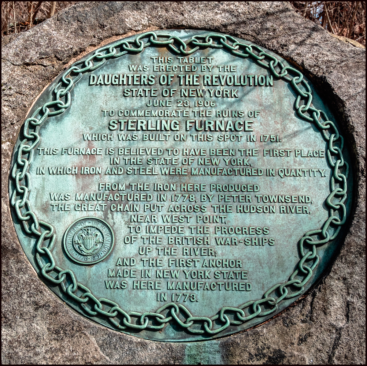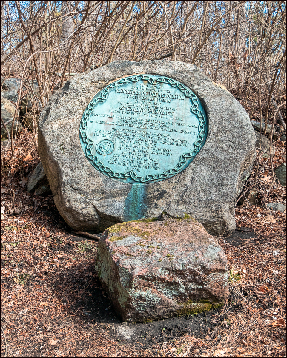 This Tablet by the side of the trail was placed by the Daughters of the Revolution to commemorate the Sterling Furnace and its many historic firsts including producing the iron for the first anchor made in NY State and the links of the Great Chain that stretched across the Hudson River in 1778 in hopes of stopping the British fleet.