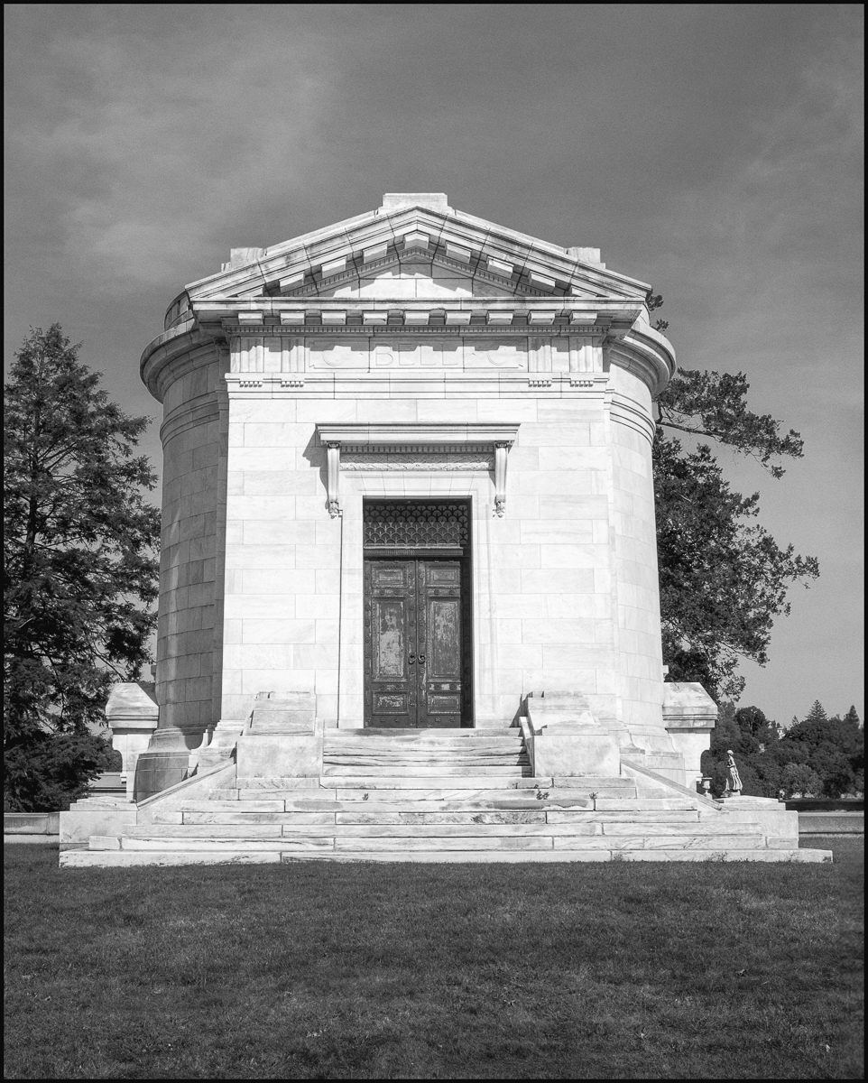 A wonderful example of the architectural influence of ancient Rome. The gravesite in the name of Bell is on a rise with dignified steps leading to the decorative door. The rounded shape of the mausoleum and the pediment above the entrance are clearly derived from Roman architecture. This is the largest mausoleum in Kensico in terms of square footage.