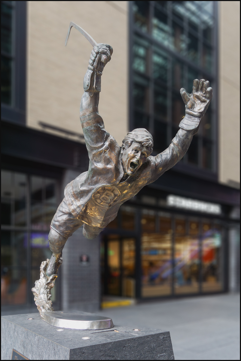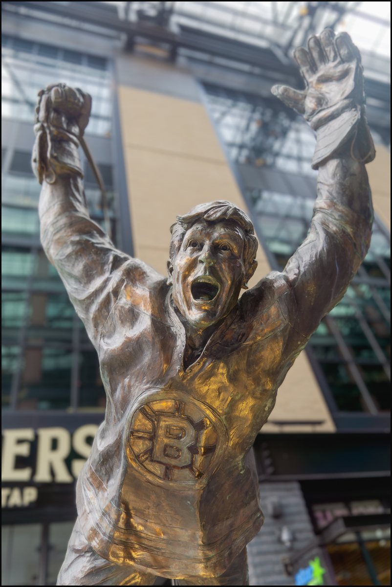 The statue is An 800-pound (360 kg) bronze statue of Bobby Orr. The sculpture was designed by Harry Weber and unveiled on May 10, 2010.