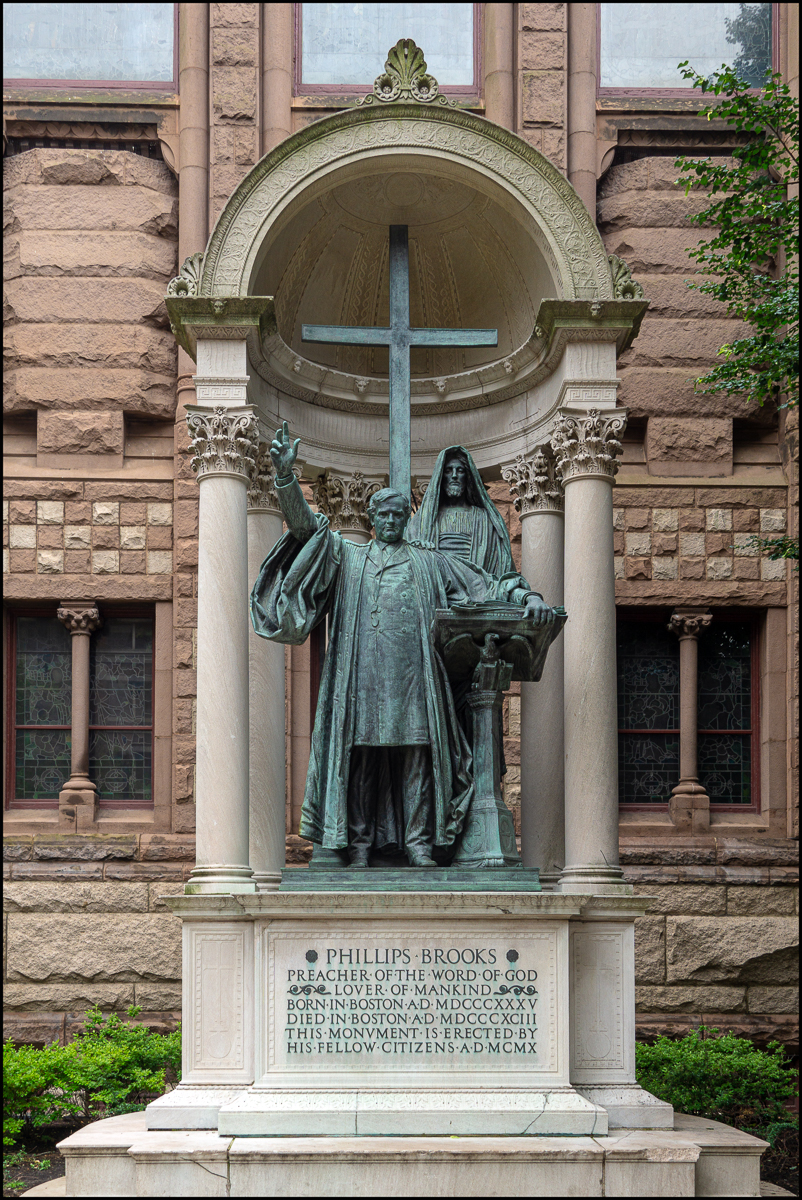 This statue of Phillips Brooks is installed outside the Trinity Church. The memorial is credited to sculptors Augustus Saint-Gaudens, Frances Grimes, and architects Stanford White and Charles Follen McKim. It was commissioned in 1893 by the church congregation for $80,000 and completed from 1907–1910.