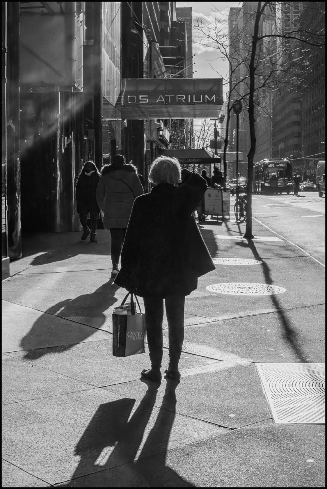 This was taken on Third Avenue around 51st Street. I saw two elderly people approaching: a man using a walker and a woman. The woman stopped for some reason, (maybe to look in a store window?) and without her noticing the man continued on down Third Avenue. After a while she looked up again from whatever she was doing and noticed that he was nowhere in sight. Here she’s looking directly into the sun down Third Avenue to see if she could see him. For a guy with a walker he certainly moved very quickly. While I don’t know how this story ended, I imagine she found him eventually. I didn’t stick around to find out.