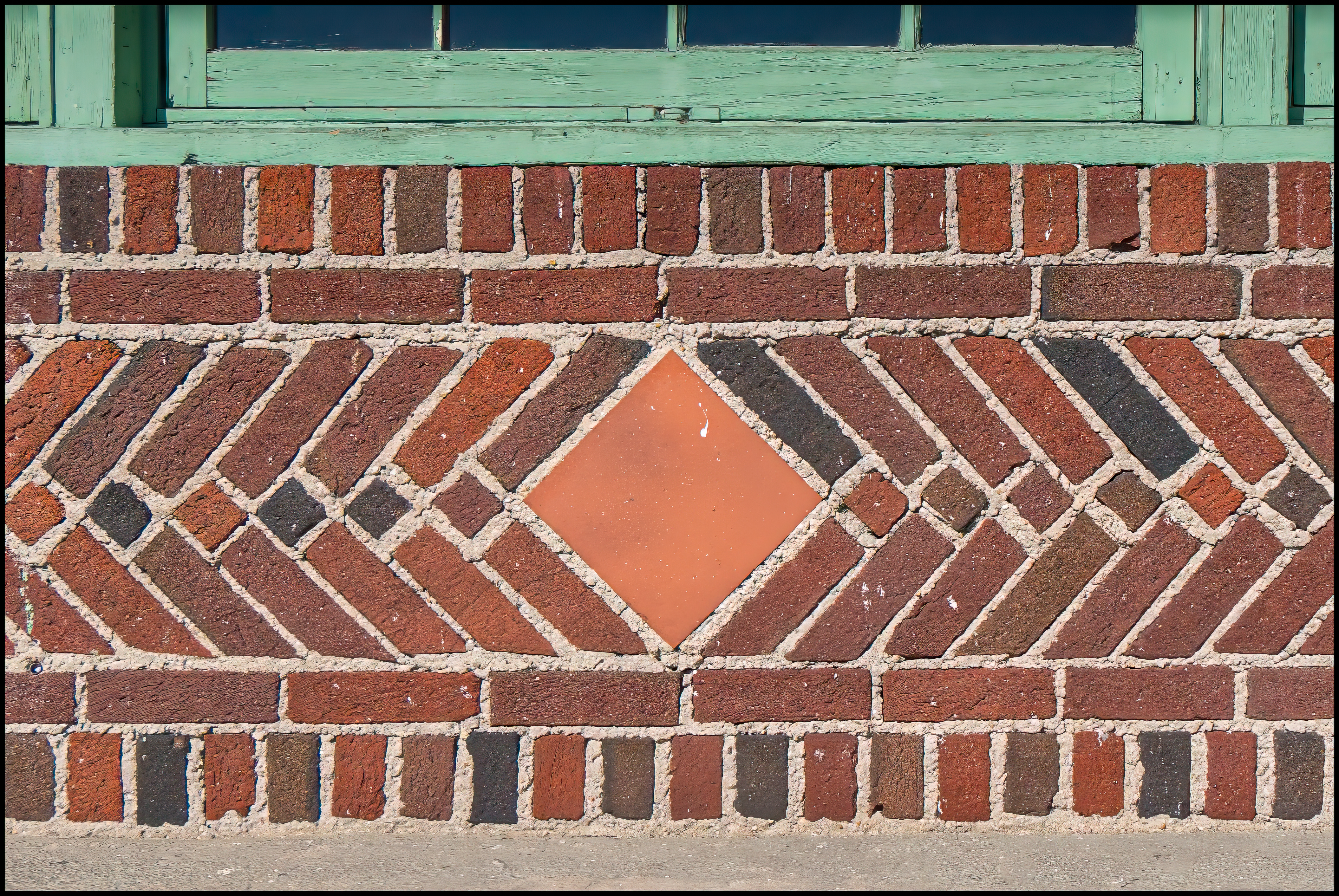 I like the contrasting colors of the bricks, the patterns formed by them, their textures and the weathered green paint of the windowsill.