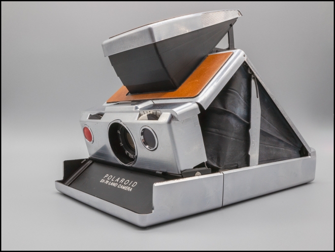 The SX-70 is a folding single lens reflex Land camera which was produced by the Polaroid Corporation from 1972 to 1981. It helped popularize instant photography…There were a variety of models beginning in 1972 with the original SX-70, though all shared the same basic design. The first model had a plain focusing screen (the user was expected to be able to see the difference between in- and out-of focus) because Dr. Land wanted to encourage photographers to think they were looking at the subject, rather than through a viewfinder. When many users complained that focusing was difficult, especially in dim light, a split-image rangefinder prism was added. This feature is standard on all later manual focus models…Though expensive, the SX-70 was popular in the 1970s and retains a cult following today. Photographers such as Ansel Adams, Andy Warhol, Helmut Newton, and Walker Evans praised and used the SX-70. Helmut Newton used the camera for fashion shoots. Walker Evans began using the camera in 1973 when he was 70 years old. Not until the $40 Model 1000 OneStep using SX-70 film became the best-selling camera of the 1977 Christmas shopping season, however, did its technology become truly popular. More recently, it was the inspiration for the Belfast alternative band SX-70’s name. (Wikipedia).