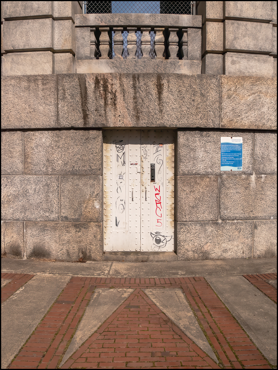 Interior view of the north side of the Kensico Dam West Pavilion. There’s lettering over the columns but I didn’t spot it at the time and so didn’t record what it said. From the pictures I think it’s from Psalm 146:18, which reads: “He sendeth out his word, and melteth them: he causeth his wind to blow, and the waters flow.” I think the lettering of on the north side of the west pavilion (seen in this photograph) has the second part (“He causeth his wind to blow, and the waters flow.” I’m guessing that the inscription on the south side probably contains the first part (“He sendeth out his word, and melteth them”). Once upon a time you could have looked through the arches towards the reservoir. You still can, but the view is somewhat obstructed by the mesh put there, presumably to stop people from jumping.