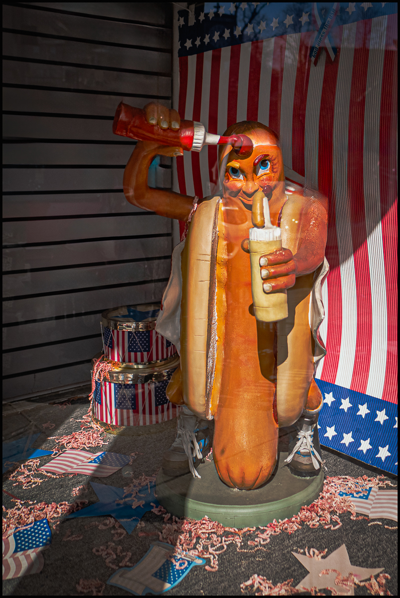 This rather strange figure in a shop window in Ossining, NY caught my eye. I found myself wondering if it was a one off or something that was more generally available. After a while spent browsing the internet I discovered that it’s quite common and always contained the same elements: a hot dog bun, a hot dog, a ketchup bottle, a mustard bottle, a human-like face, and an association with the US flag. It was often referred to as “Hot Dog Man”, so that what I decided to use for the title of this post.
