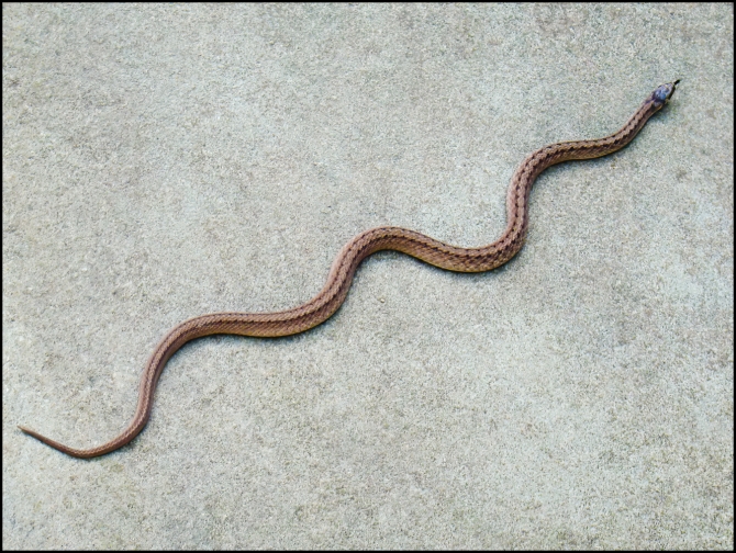 A couple of days ago I came across this on the walkway to my front door. I don’t know much about snakes and have no idea what kind this might be: maybe an Eastern Ratsnake?
