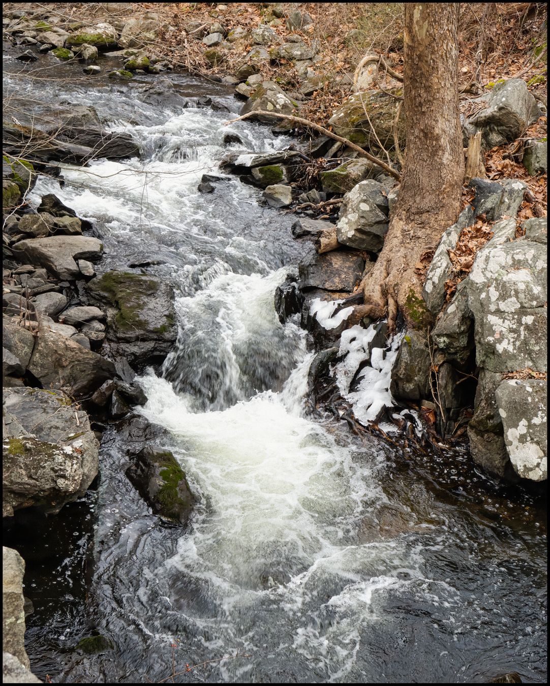 As you can see it’s hardly a roaring torrent at this part of its course. Not even what you’d call a river in fact? It does get a bit more interesting in other parts e.g. see picture below of the so-called Pocantico Falls in Rockefeller State Park Preserve. (picture taken with an Olympus OM-D EM-10 and Panasonic Lumix G Vario 14-42 f3.5-4.6 II in January, 2021