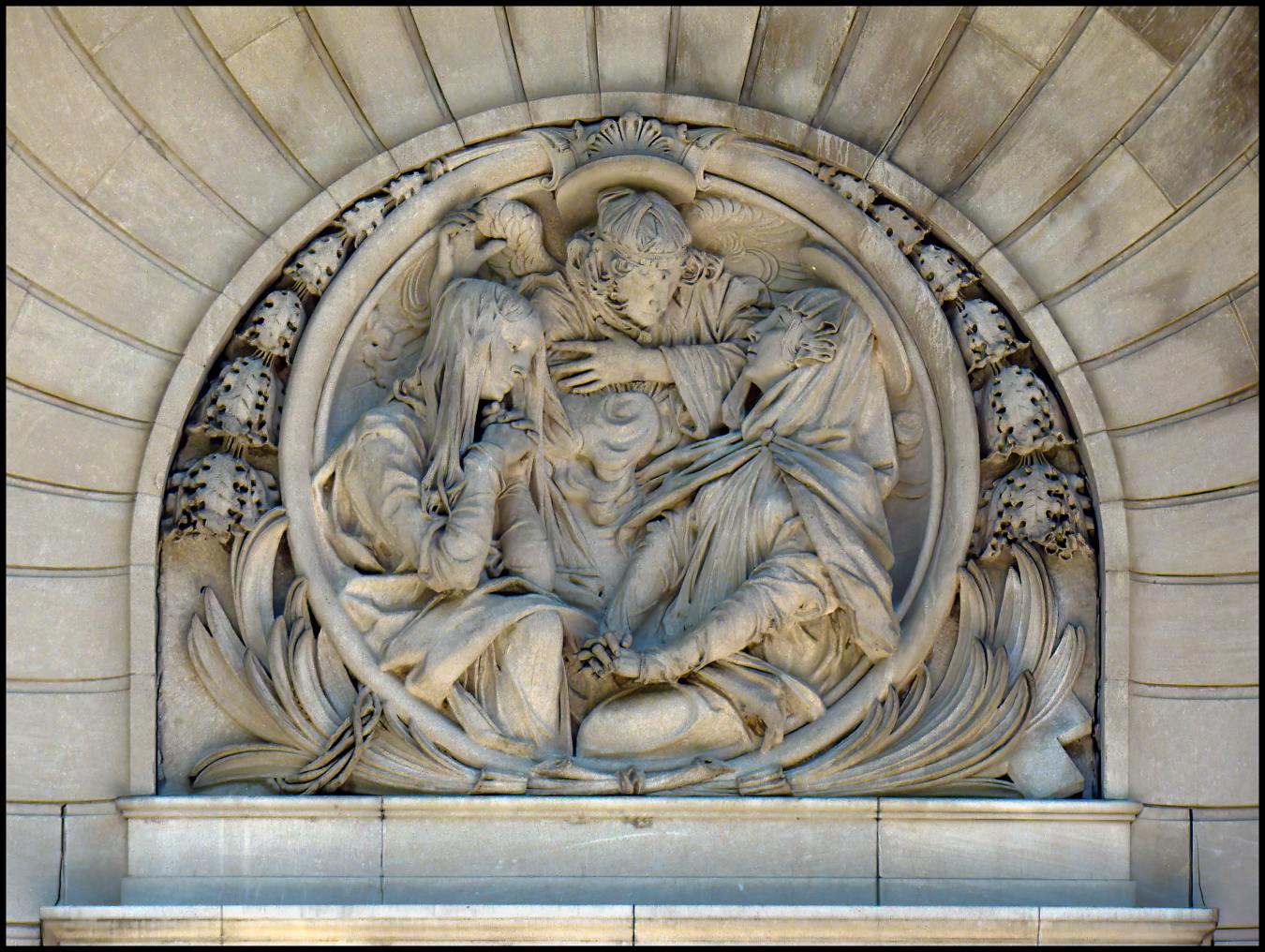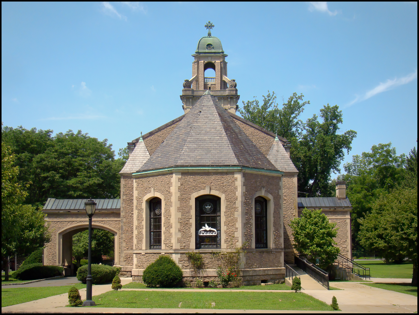 After Elliott Fitch Shepard’s death in March 1893, Margaret donated the present church building and manse. The Spanish Renaissance-style church was designed by Augustus Haydel (a nephew of Stanford White) and August D. Shepard (a nephew of Elliott Shepard and of William Rutherford Mead. The two nephews later designed the 1899 Fabbri Mansion in Manhattan. The church’s cornerstone was laid on October 13, 1893. During construction of the building’s foundation, workers found quicksand, though Shepard was intent on constructing the church there and had the construction workers dig 30 feet into the ground to find firm ground for the foundation. European workers were brought to the site to aide in the building’s construction. The Italian Renaissance Revival building was of limestone delivered from Indiana by railroad, requiring a special track laid at Scarborough to accommodate the delivery. The completed church was dedicated on May 11, 1895, in memory of Elliott Fitch Shepard. It was briefly known as Shepard Memorial Church. The dedication was attended by Cornelius Vanderbilt II, Frederick W. Vanderbilt, Chauncey Depew, William Sloane of W. & J. Sloane, William Seward Webb, H. Walter Webb, and James A. Burden Jr.