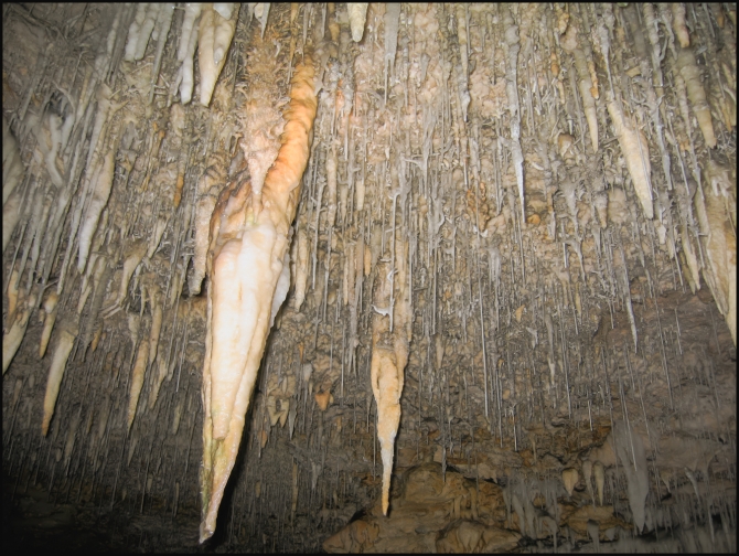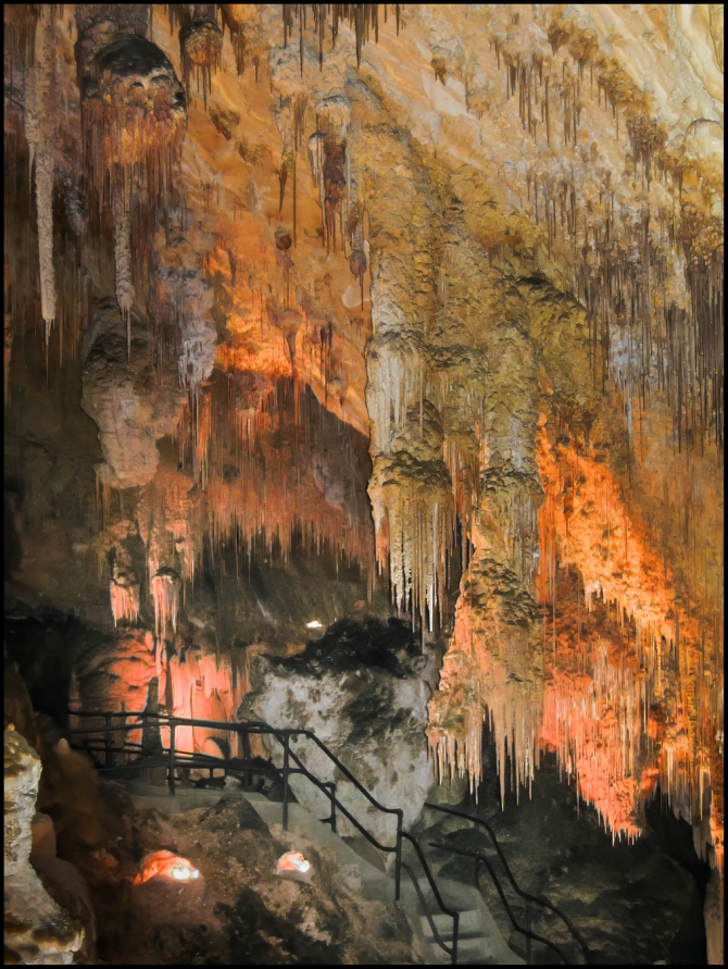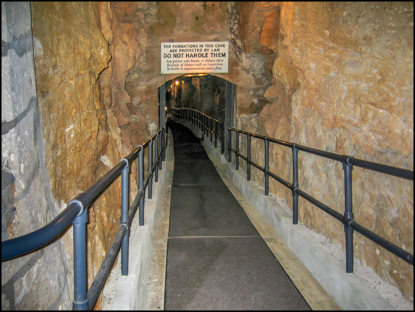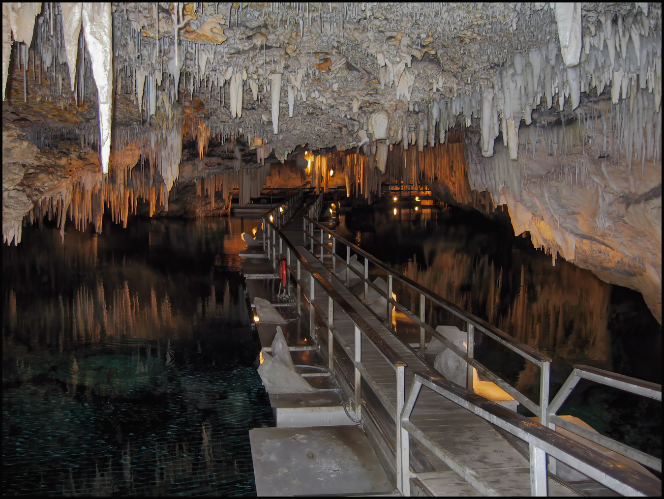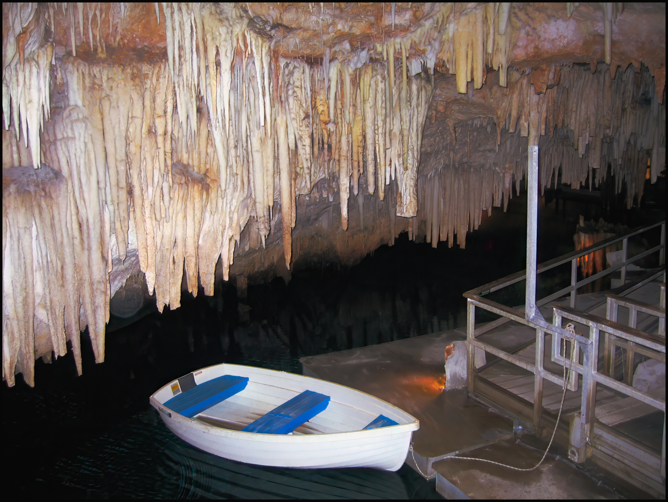 We went to Bermuda in April, 2005. Bermuda is a lovely place: picturesque, clean, well-organized – a sort of Switzerland in the North Atlantic. I was actually surprised that it was in the Atlantic as I’d always thought of it as being in the Caribbean. Nice though it is it’s also quite small and unless you want to spend all of your time in/at/around the water there’s not all that much to do. There are a few excursions though and one day we went on one of them: to these caves. From the entrance to the caves you go down a very steep set of steps. That finished my wife. She has a fear of heights and just couldn’t go down, so she said she wait for me outside. So down I went. I’m glad we went. I like caves and these were pretty impressive. Wikipedia describes them as follows: