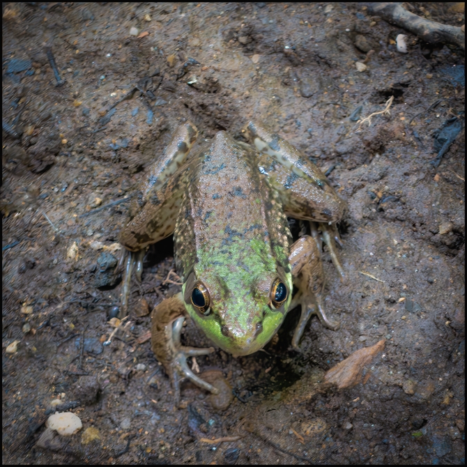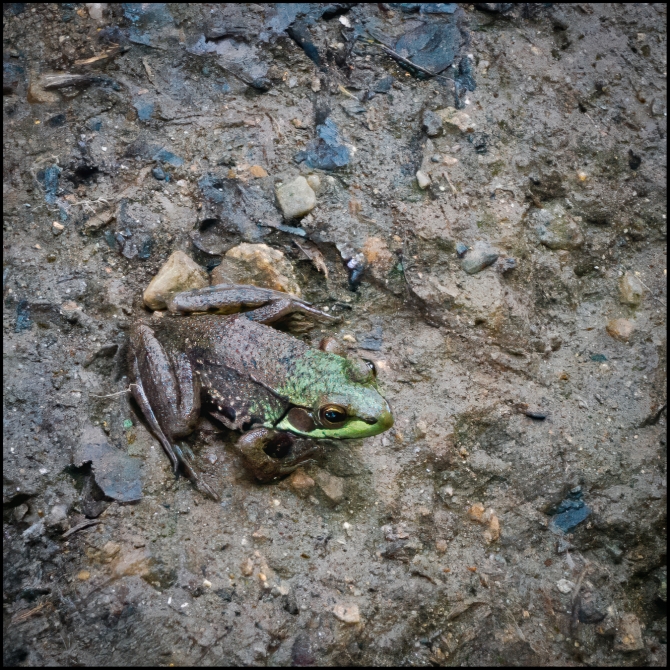 Anyway, we passed by the other day and heard a ‘plop’ as something jumped into the accumulated water. Looking more closely we noticed that a number of small frogs had taken up residence. Luckily, one of them was kind enough to stay at ground level and pose for me. He/she is the frog (two views of a single amphibian) in the pictures. Eventually he/she got bored, dove into the water and disappeared.