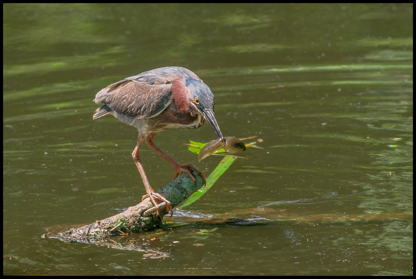 In spring it’s full of large frogs, which produce large numbers of tadpoles which in turn attract water birds such as cormorants, egrets and herons like the green heron below (taken at the Law Park Pond, but not during the current walk)