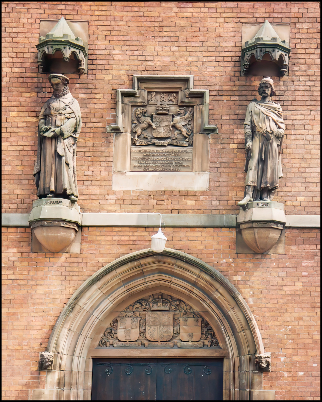 Town Hall and Market Hall, 1889. The building was designed by Thomas Bower in Gothic Revival style. It is in red brick with stone dressings and is expressed in two storeys. In the ground floor are four arches divided by buttresses, behind which are shops, and beyond these is the market hall. The upper storey contains three-light mullioned windows. To the right is a four-stage tower with a heraldic panel flanked by statues above the door, clock faces in the top stage, and a pyramidal roof with a cupola. On the left side is a gabled bay with mullioned and transomed windows.