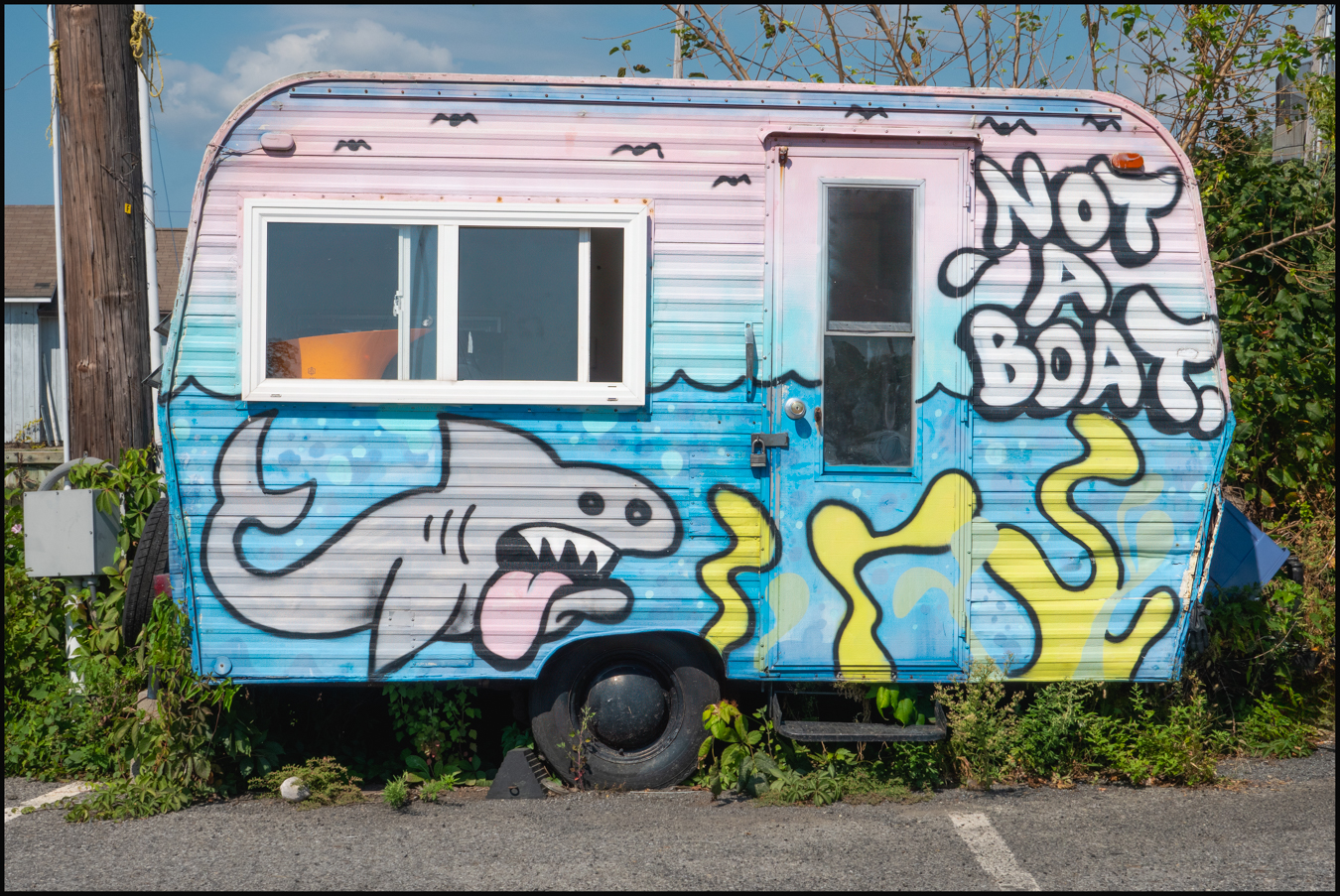 I guess I just liked the colors and the graffiti (if that’s what it is). At first, I thought it was just an abandoned trailer. Curiously it’s right next to a fairly flashy restaurant and an equally fancy yacht club. I still wonder why it’s there, but I suspect that it’s not abandoned. Look at the tires. If it had been abandoned for some time surely they would have been flat.