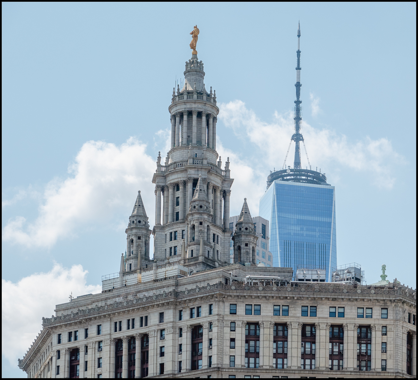 The David N. Dinkins Manhattan Municipal Building (foreground) and the World Trade Center Building (background)