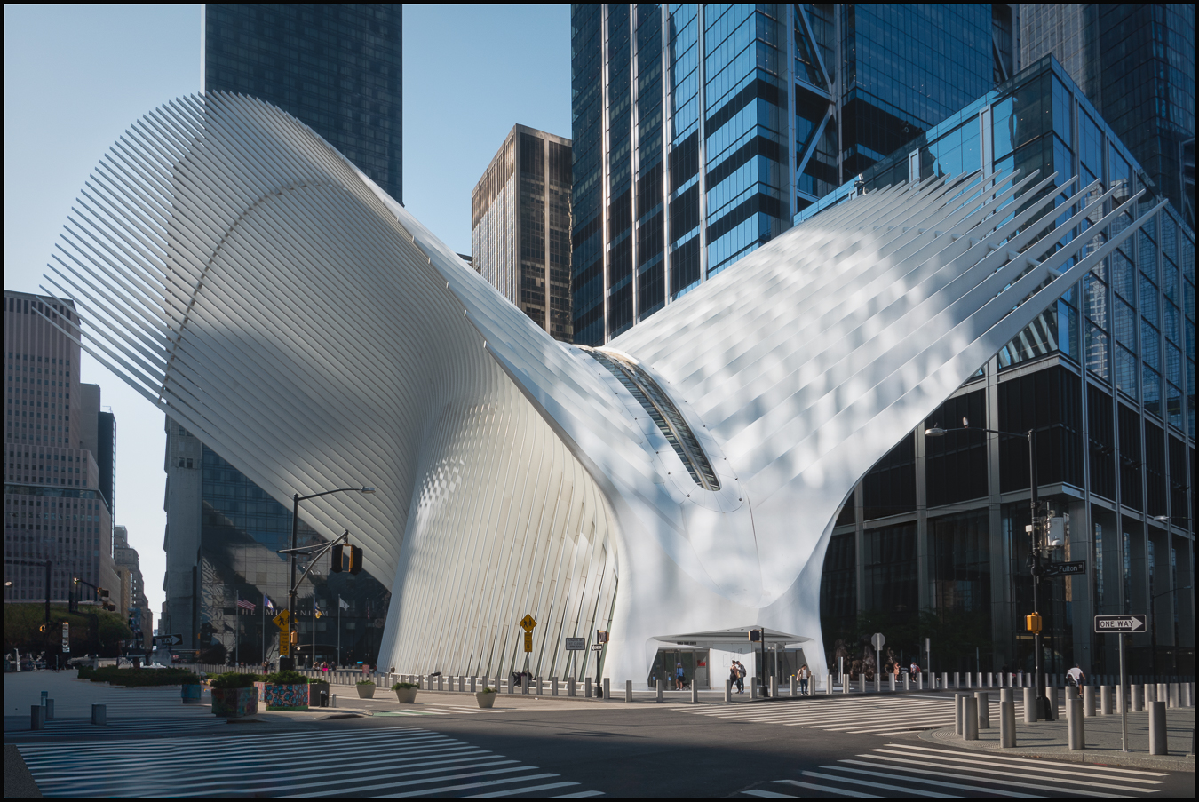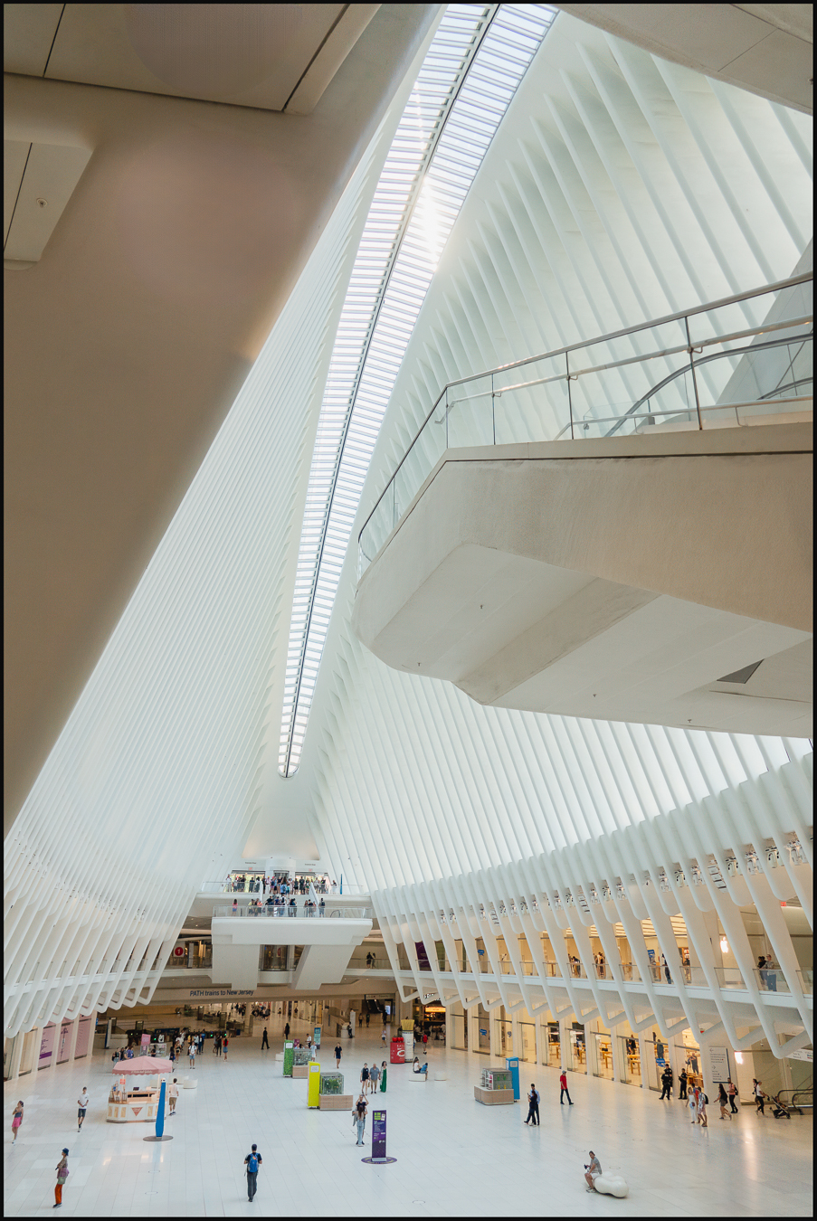 The Oculus in NYC is an artistic landmark located within walking distance of the World Trade Center. The transit hub, serving the PATH, cost four billion dollars, making it the most expensive train stop in the world. With its sleek and modern design, it immediately became an attraction in Lower Manhattan. The Oculus is the centerpiece of The World Trade Center Transportation Hub. After 12 years of construction and constant delays, it finally opened to the public on March 3, 2016. Designed by famed Spanish architect Santiago Calatrava, the $4 billion building exceeded the original estimate by 100%! In total, the WTC Oculus is 350 feet long and measures about 75,000 square feet of retail space. In fact, the Oculus blurs the line between a railway station, shopping center and pedestrian tunnel. For me, the Oculus is one of New York’s most beautiful structures. From the outside, the Oculus resembles a bird being released from a child’s hand inspiring love and hope in the city. On the inside, the cavernous hall is flooded with natural sunlight thanks to the large skylights. The luminous space features white marble flooring harmonizing with its bright, sleek interior design.