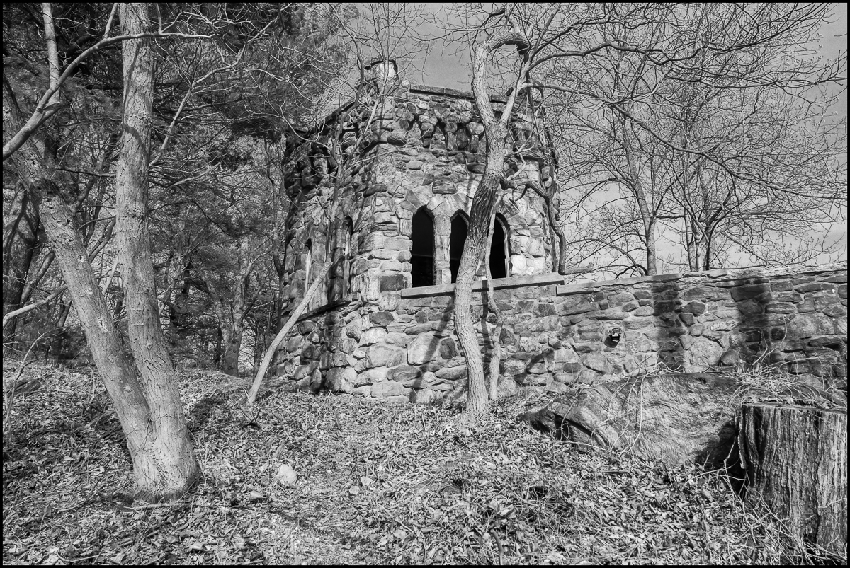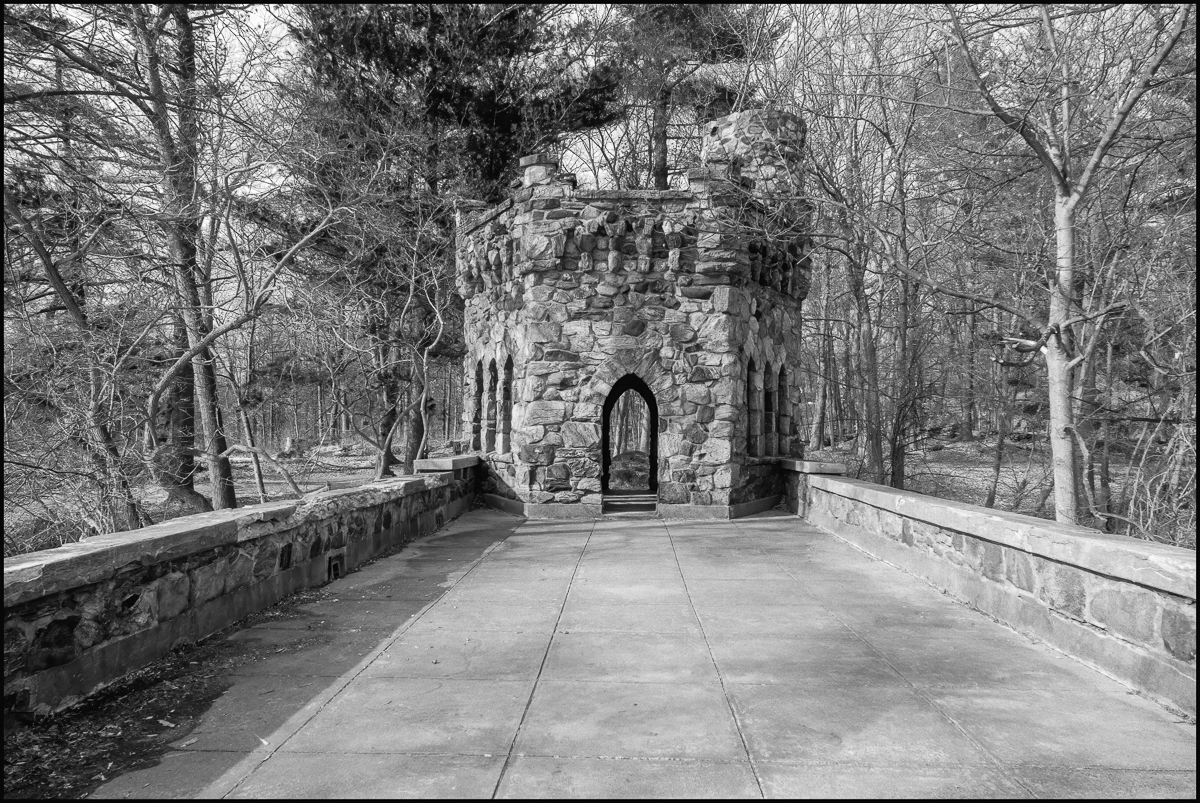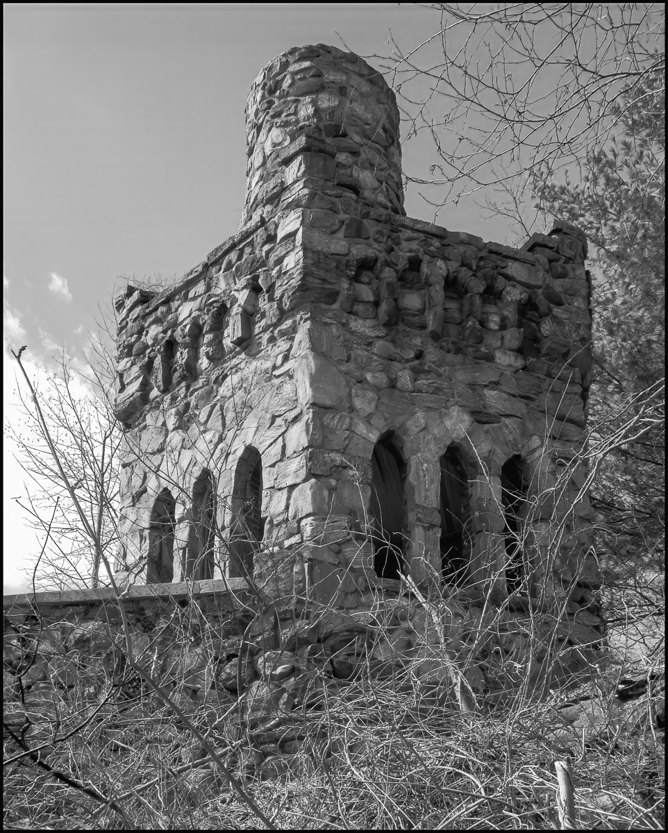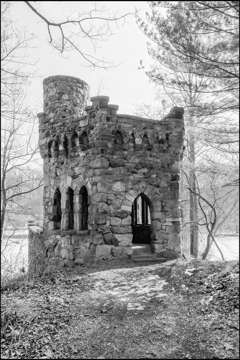 Beltzhoover Teahouse, the last remaining structure of the once-grand estate, is a little turn-of-the-century castle, with an open hexagonal tower featuring gothic arched windows and a roof terrace overlooking Halsey Pond.
